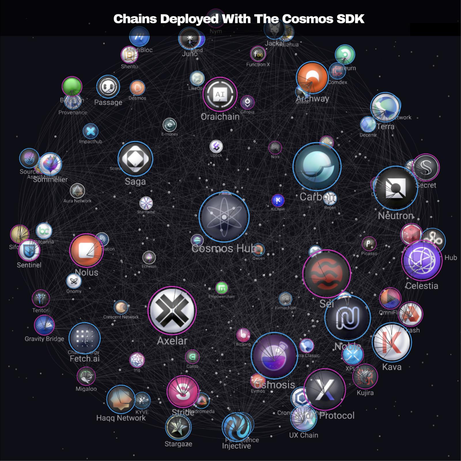Chains built and launched with the Cosmos SDK include Osmosis, Celestia, Polygon PoS (partly built with Cosmos SDK), Cronos PoS, Injective, Axelar, DYDX and Thorchain.