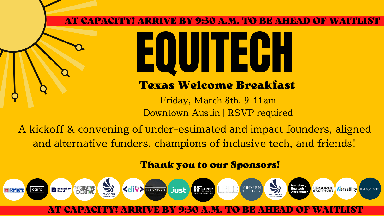 This Equitech in ATX breakfast event to kick off the big Festival will be a place for a mix of mission-driven, under-estimated founders, funders, and allies to convene, make connections, and celebrate each other!