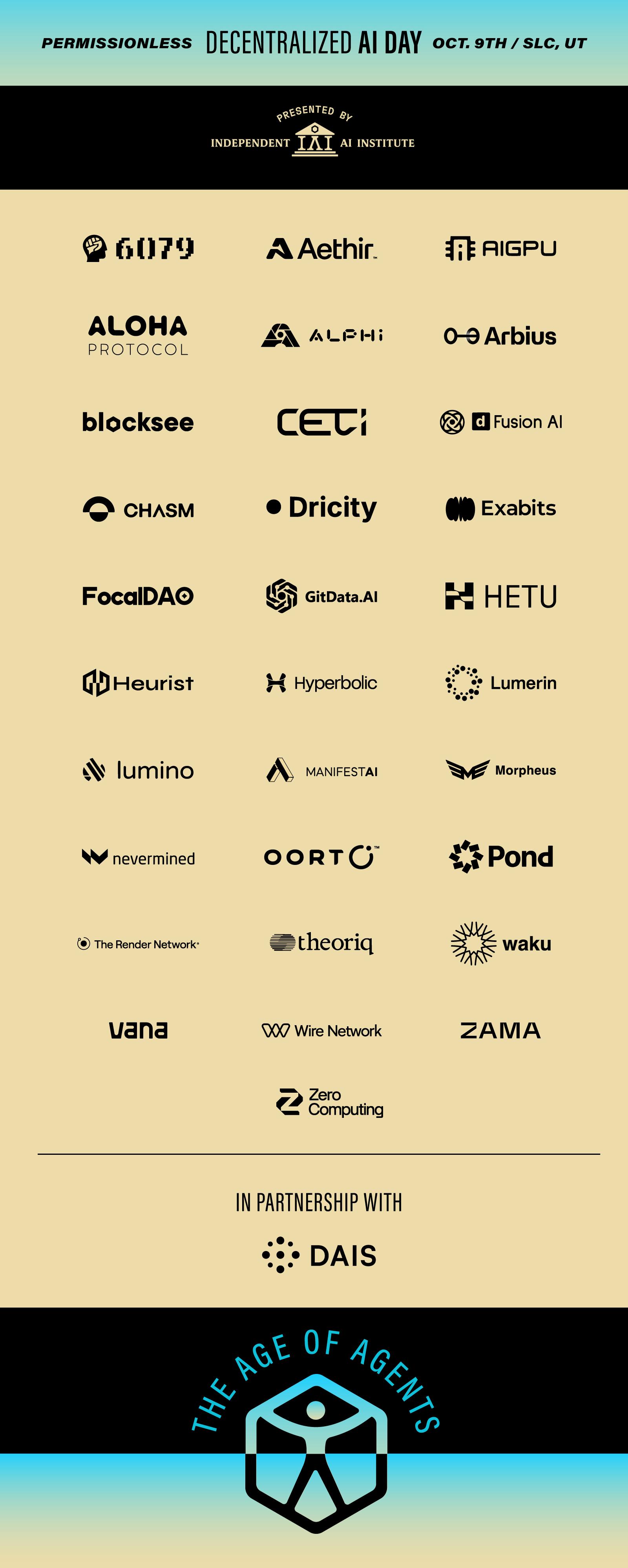 DeAI Day: The Age of Agents is part of a disruptive movement happening at the deepest layer in Ai - and if you are reading this, it is likely that your life is dedicated to decentralizing Ai, or making Ai independent. We are the pioneers. Together, and only together, we can stand up to the giants in this space to own our intelligence and maintain the right to transact.