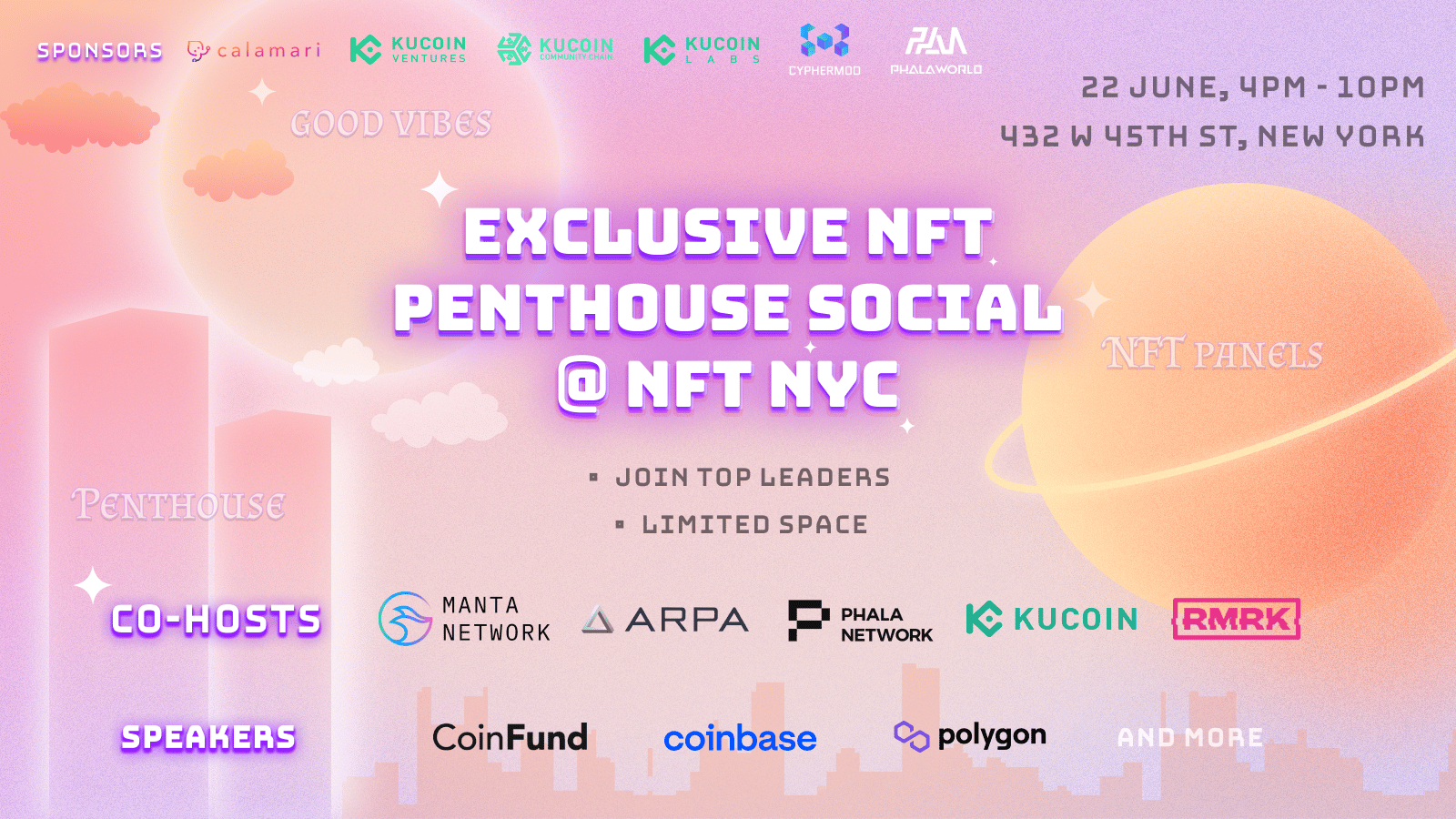 Join cohosts Manta Network, ARPA, Kucoin, IVC, Phala, and RMRK for an evening of private discussions and networking in an exclusive penthouse setting steps away from NFT NYC. Space is limited.