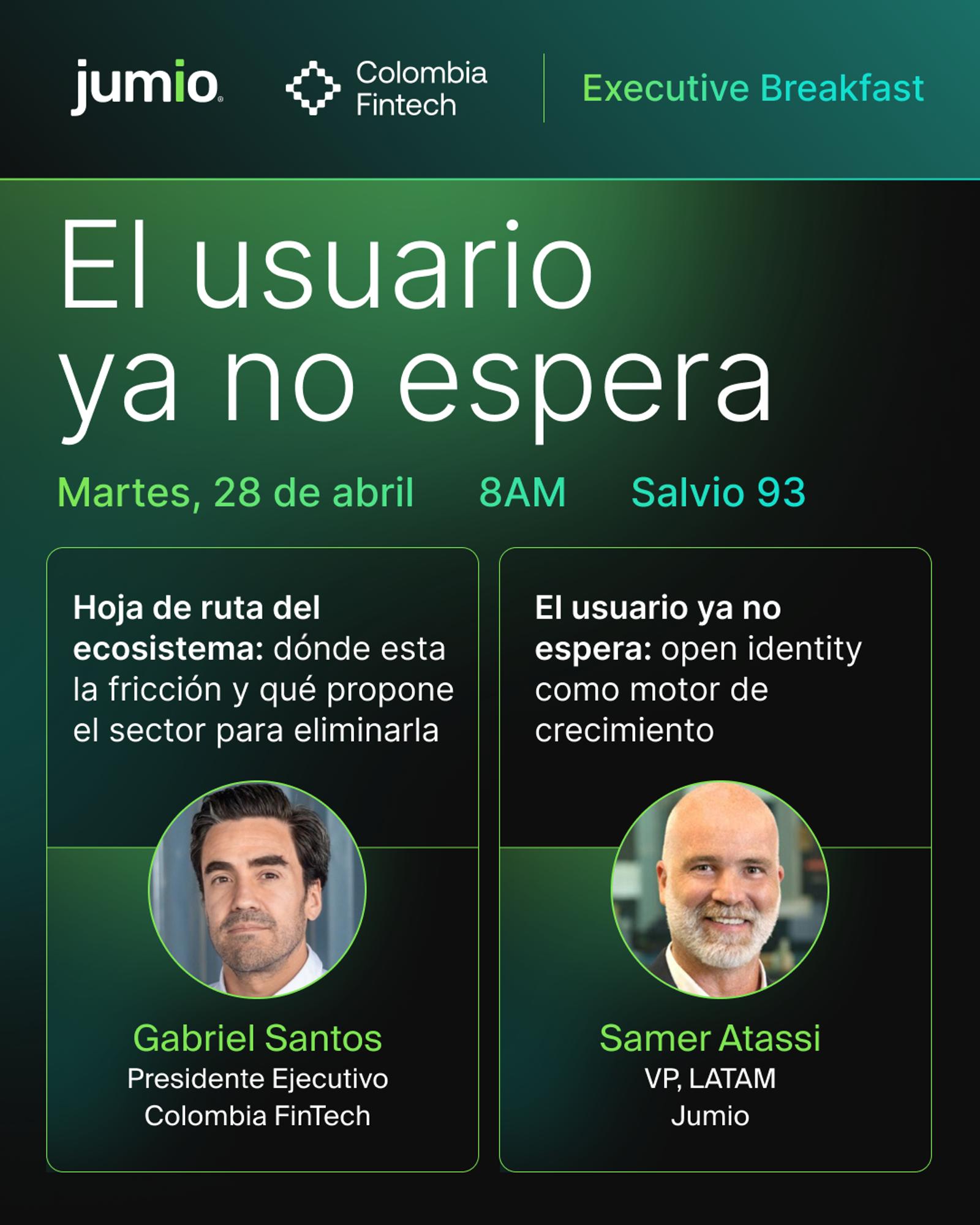 En este desayuno, Colombia Fintech comparte su hoja de ruta para el sector financiero en 2026 y lo que significa para los usuarios del sistema. Jumio trae a la conversación open identity: cómo las empresas pueden ser más ágiles para sus consumidores sin sacrificar la seguridad.