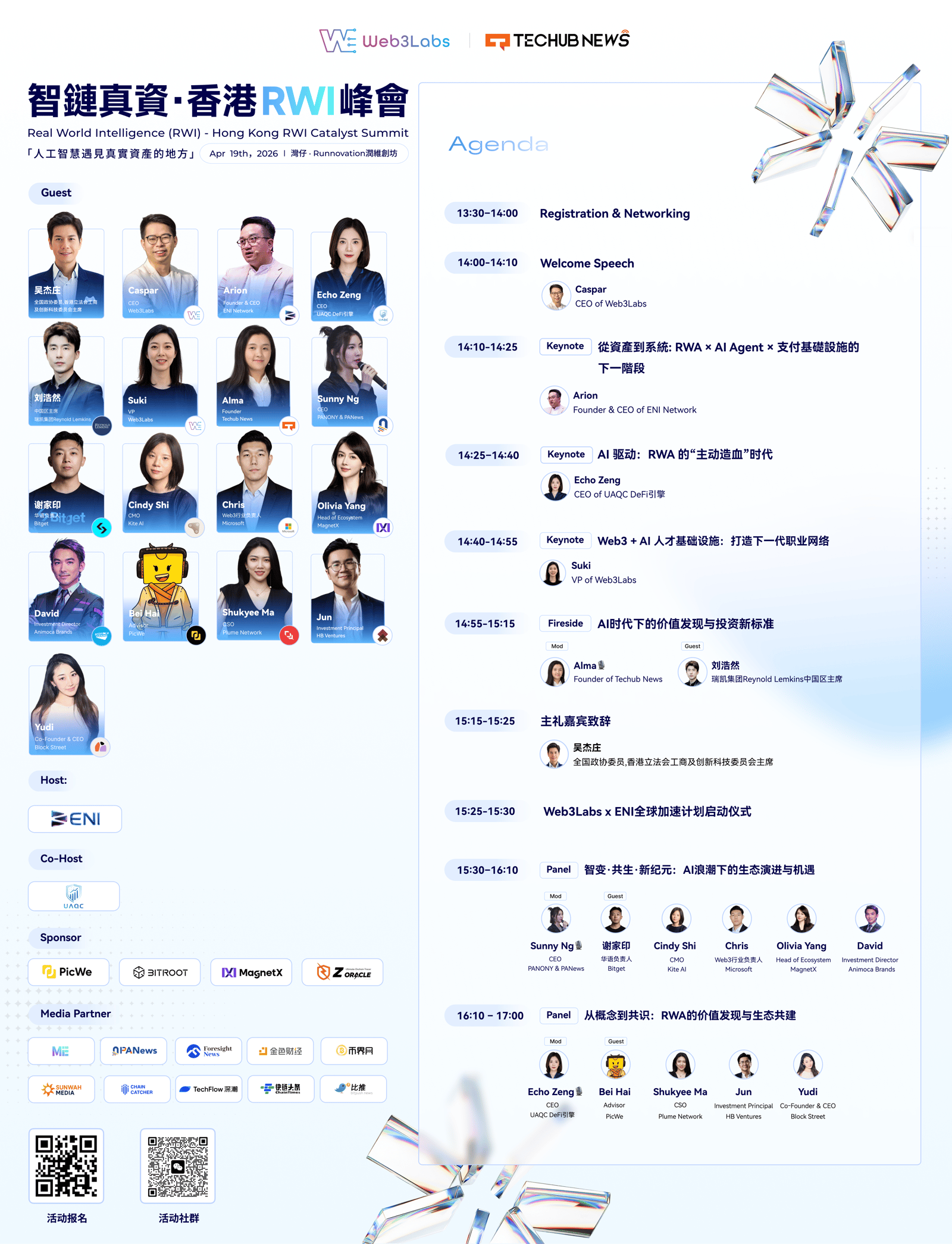 「智鏈真資 · 香港 RWI 峰會」由 ENI 主辦,並由 Web3Labs和Techub News 聯合承辦,,是香港 Web3 Festival 期間的重磅活動之一。本次峰會以 「催化 AI 與真資的未來」 為主題,聚焦人工智慧(AI)與真实世界资产(RWA)的融合,探討代幣化、合規監管、跨境流動性與產業鏈聚合等核心議題。