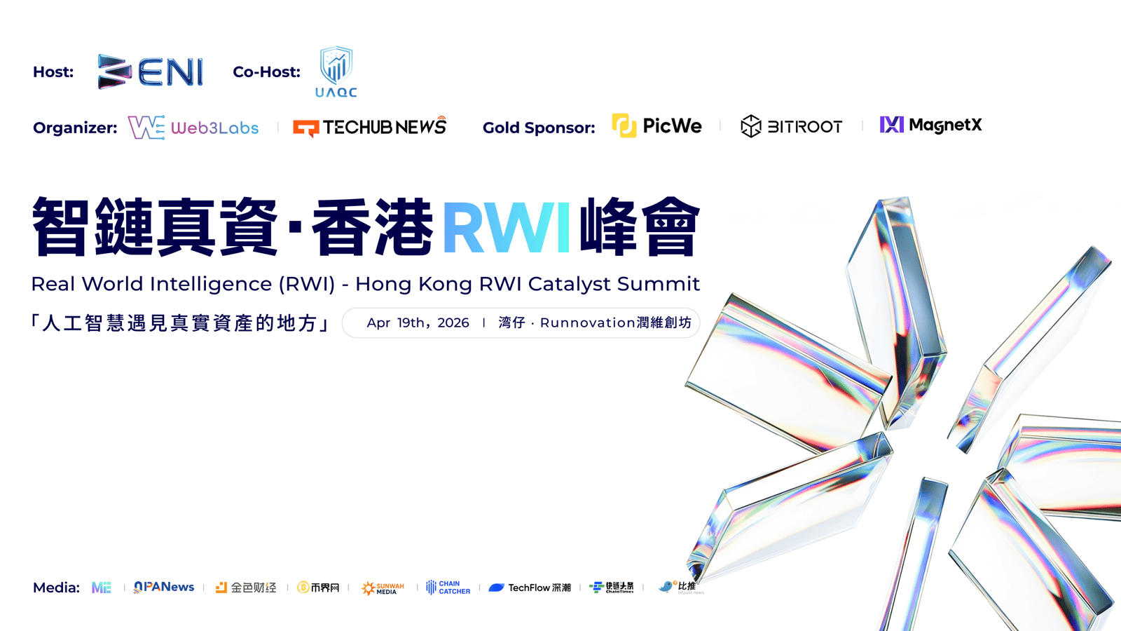 Real World Intelligence (RWI) — Hong Kong Catalyst Summit is a flagship event during Hong Kong Web3 Festival, hosted by ENI and organized by Web3Labs and Techub News. With the theme “Catalyzing the Future of AI and RWA”, the summit focuses on the convergence of Artificial Intelligence (AI) and Real-World Assets (RWA), exploring tokenization, regulatory frameworks, cross-border liquidity, and industry chain consolidation.
