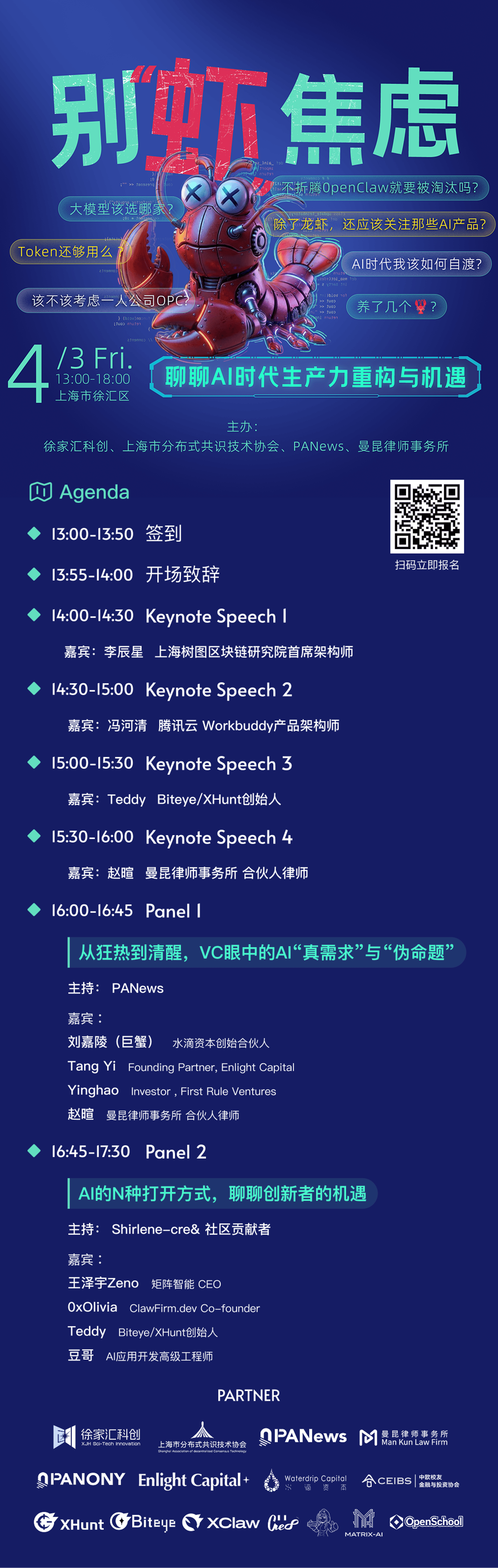 本次活动以 「别“虾”焦虑,聊聊AI时代生产力重构与机遇」 为主题,试图从生产力演进与社会结构变化的视角,展 开一场开放而深入的讨论。