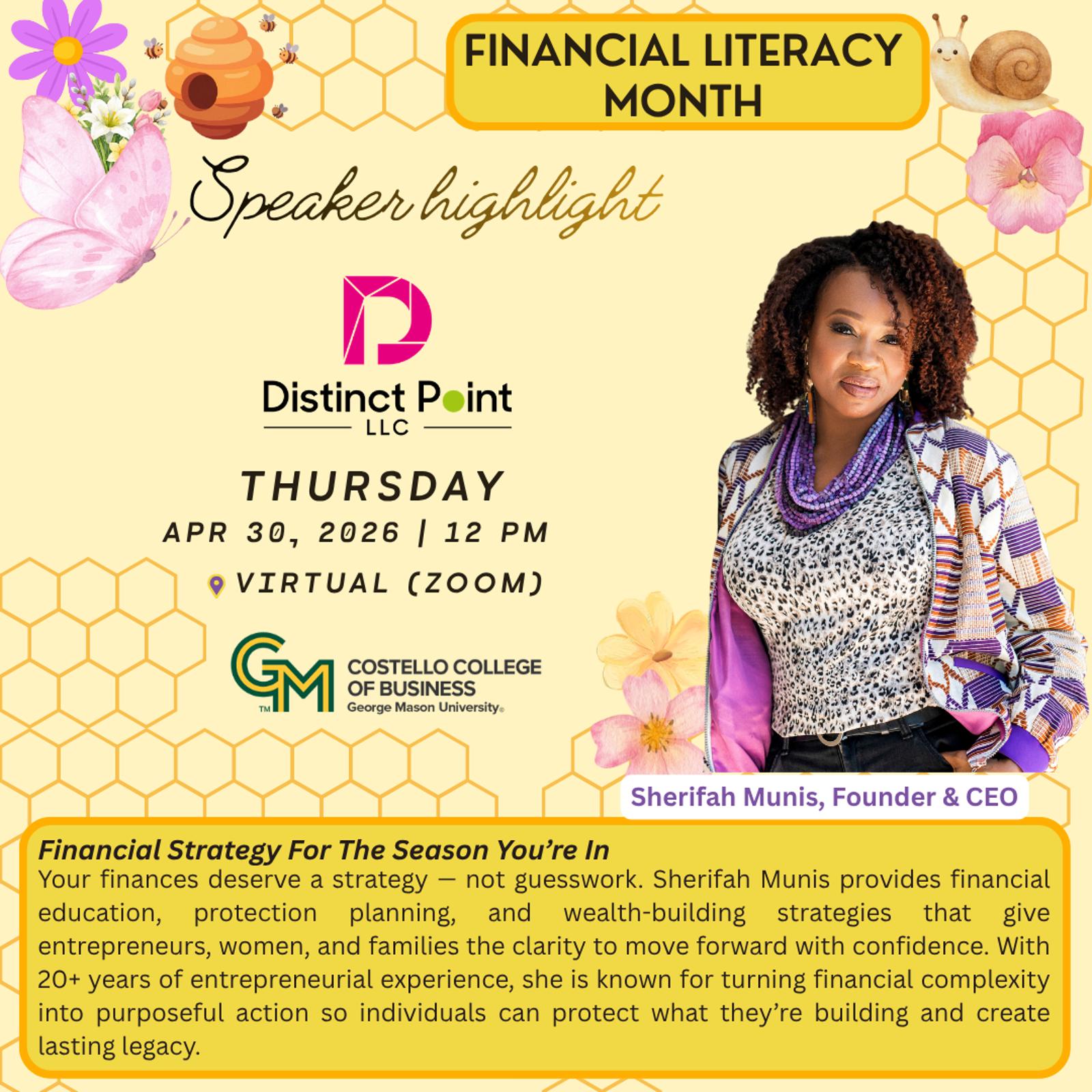 April is Financial Literacy Month, and we are excited to bring you a special event featuring our very own Sherifah Munis. This event will include a featured keynote session and an interactive workshop designed to engage students and emerging leaders. Together, we will explore financial literacy strategies, impact investing, and other vehicles to help steward financial resources effectively. This event is ideal for emerging leaders, aspiring investors, and students pursuing business, finance, or accounting.