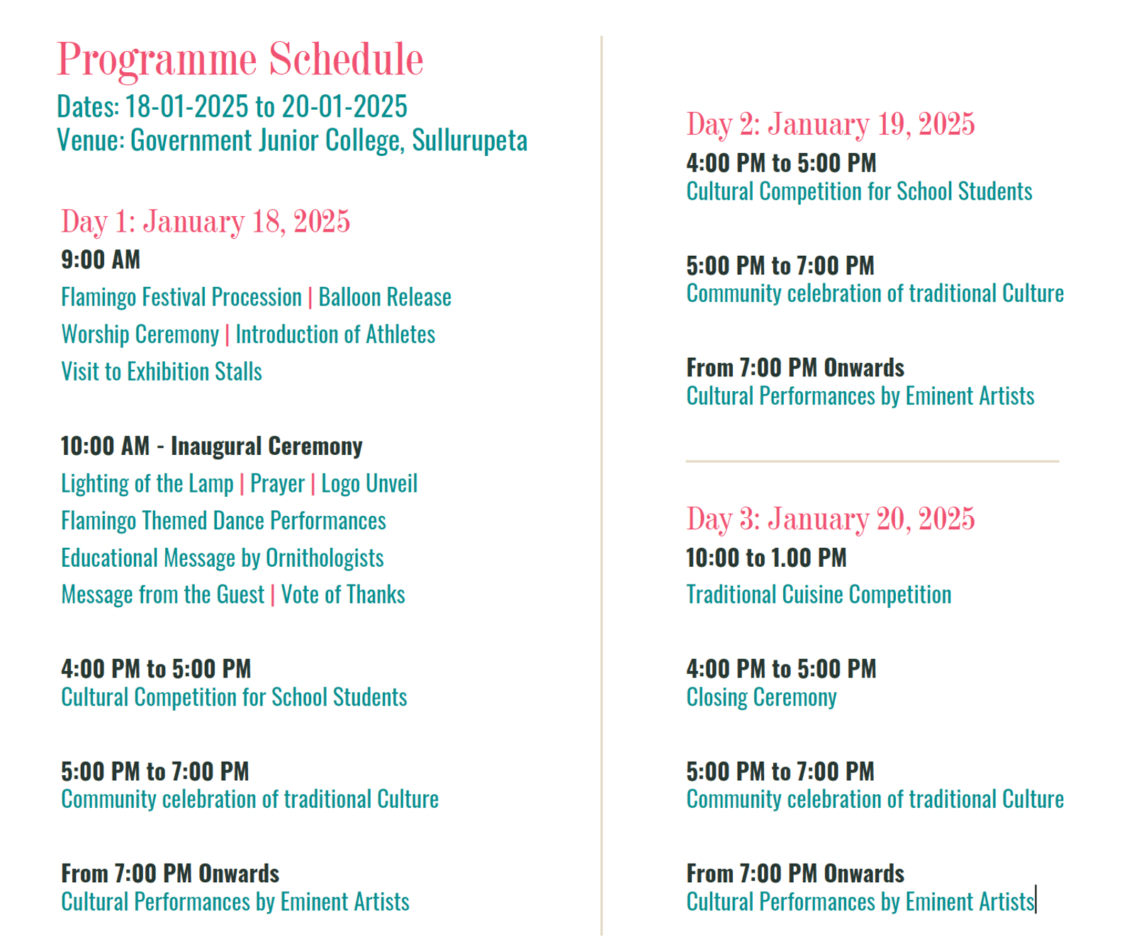 Flamingo Festival 2025 is a celebration of biodiversity, culture, and community, set in the beautiful surroundings of Pulicat Lake and Nelapattu Bird Sanctuary. Over three days, experience the wonders of nature through bird watching, snake shows, wildlife photography, symposiums, and cultural programs. Join us from January 18th to 20th, 2025, at five unique venues offering a diverse range of activities.