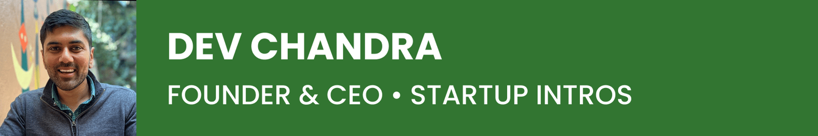Dev Chandra is the founder and CEO of Startup Intros, a thriving Bay Area startup community which helps empower founders and connects them with the right VCs at the right time. Dev is also an Associate at Context Ventures. He's spent years traveling the world as a digital nomad and brings a unique global perspective on how startups operate to his community at Startup Intros.