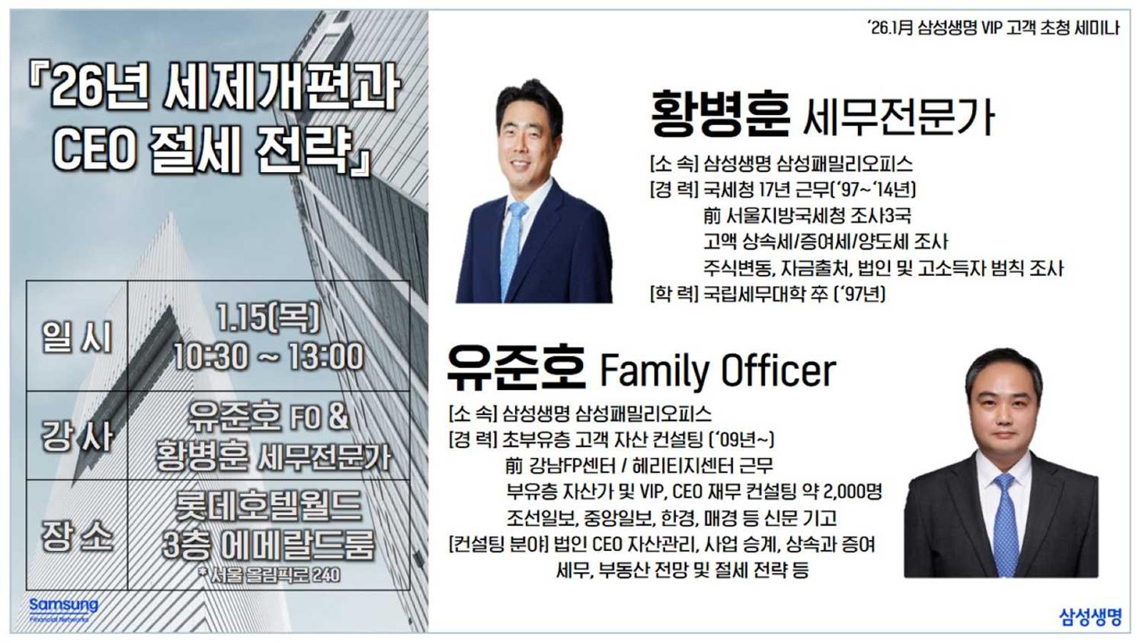 • 10:30 – 12:30: '26년 세제개편과 CEO 절세 전략 - 황병훈 세무전문가, 유준호 Family Officer