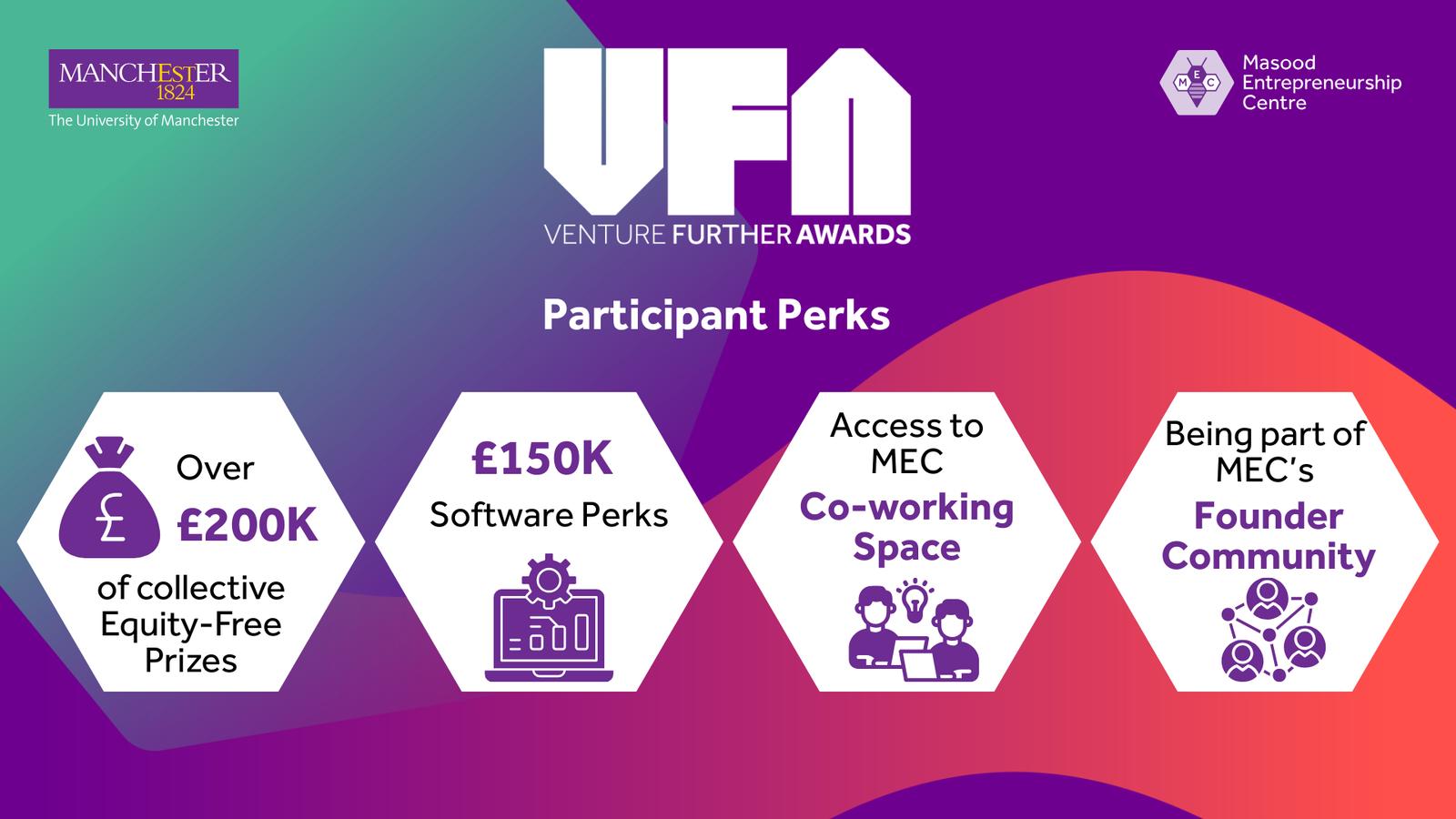 The Venture Further Awards (VFA) is the UK’s premier university startup competition, offering over £200,000 in equity-free prizes plus £150,000+ in software and tech perks to help founders build and scale. Hosted by the Masood Entrepreneurship Centre (MEC), this is where the University of Manchester’s most ambitious students and alumni transform high-potential concepts into market-ready ventures.