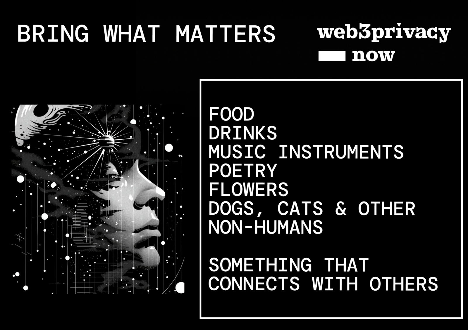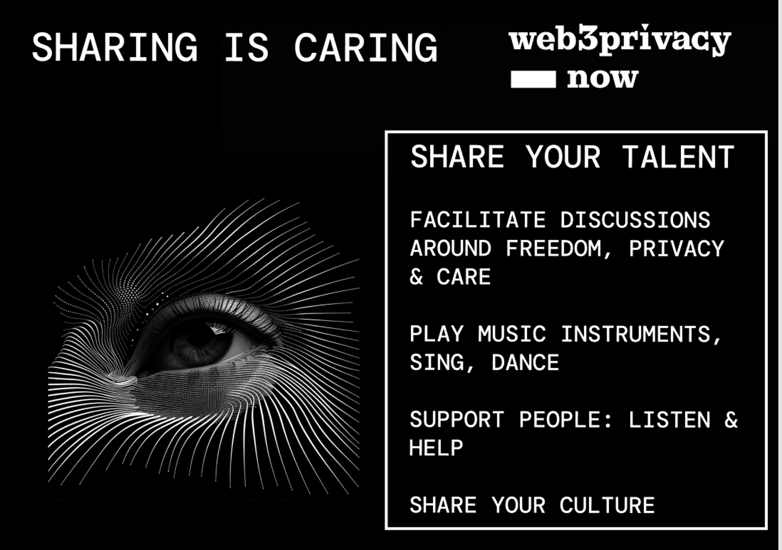 We want privacy enthusiasts, developers, researchers, freedom seekers and activists to turn off their phones & laptops - start talking with each other. Explore how we can collaborate, help & listen to stories around.