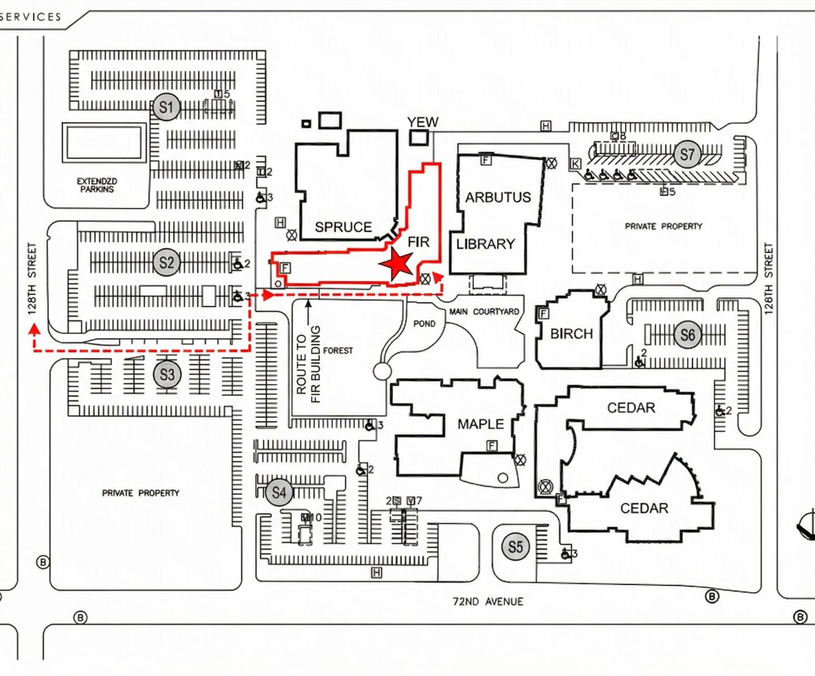 From Parkings S1, S2 & S3 (un-reserved public parkings), the map to get to the room is attached.