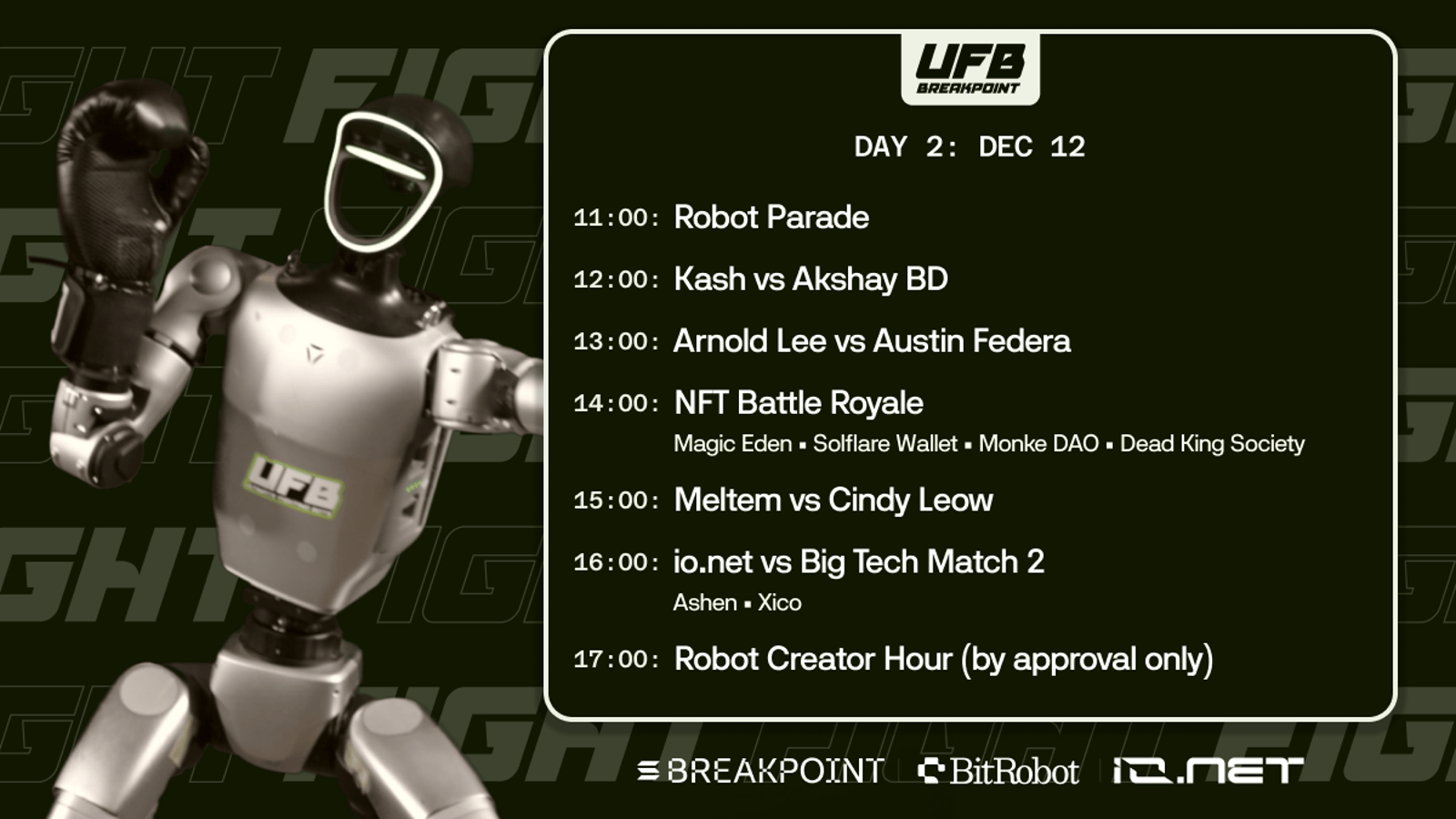 For the first time ever at Breakpoint — and in the Middle East — BitRobot Foundation, in partnership with UFB and io.net, is bringing a full live robot combat arena to Etihad Arena.