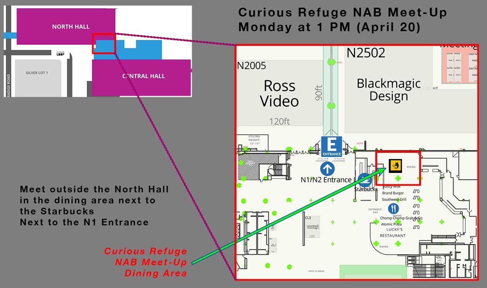 Meet us in the dining area outside of entrance to North Hall N1 (near Blackmagic)