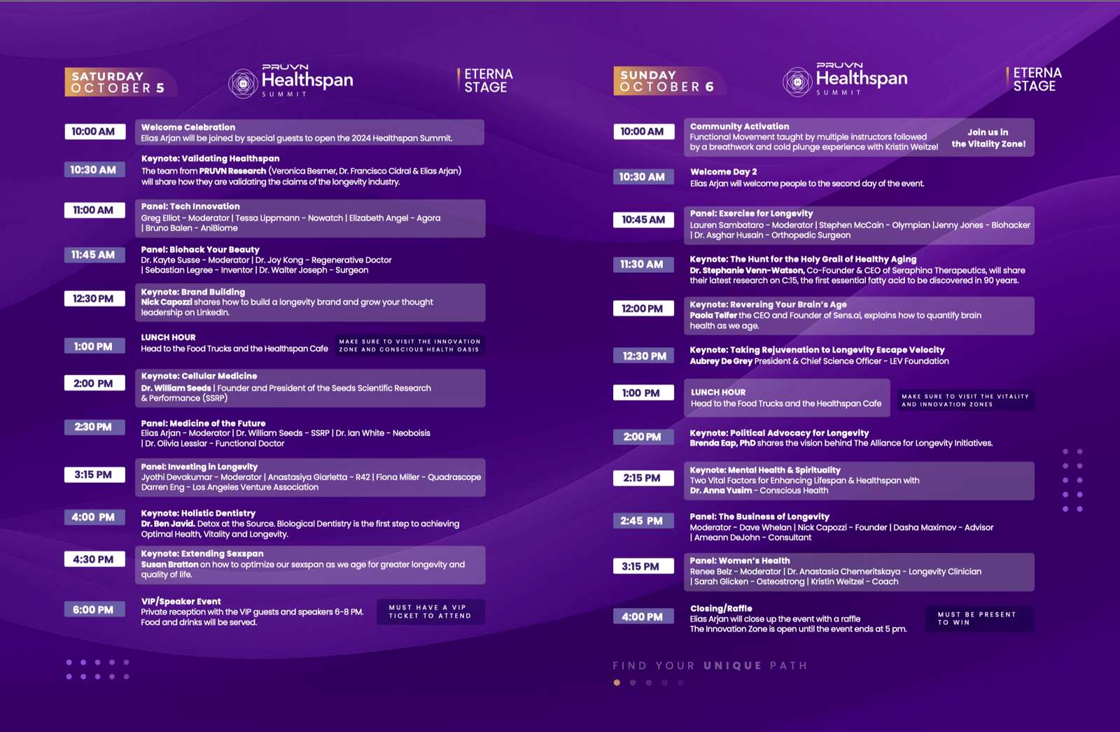 💫 Upgrade to a General Admission Ticket that include all the above + access to the Eterna Stage and a gift bag with $100 in longevity products 💫