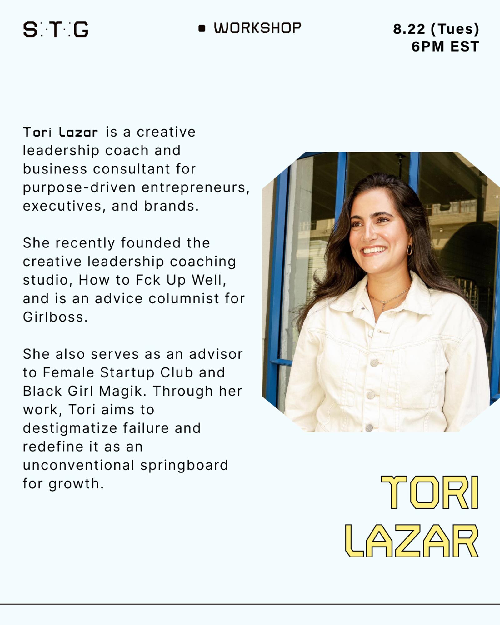 Enter, Tori Lazar – a creative leadership coach and biz consultant with over a decade of experience navigating the highs and lows of entrepreneurship, startup culture, freelance life, and lots more. Come learn how to get cozy with your f*ck ups, reinvigorate your love of learning, and build resilience in this 1.5-hour workshop. The goal? Realize winning is simply the result of f*cking up well and every bit of your journey is worth celebrating.