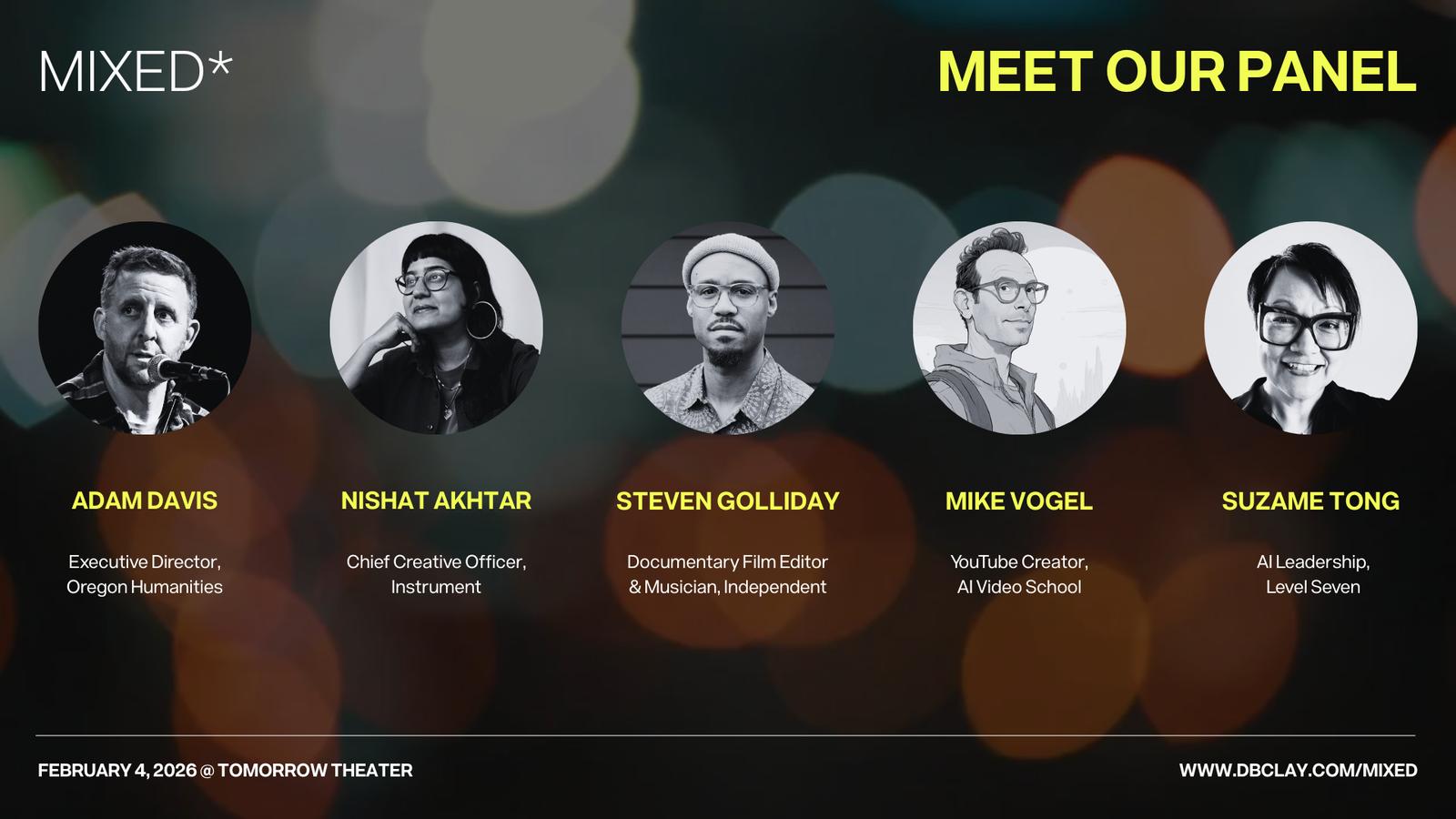 The panel will be moderated by Adam Davis, Executive Director of Oregon Humanities, and will include Nishat Akhtar (Chief Creative Officer, Instrument), Mike Vogel (YouTube Creator, AI Video School), Suzame Tong (AI Leadership, Level Seven), and Steven Golliday (Documentary Film Editor, Independent).