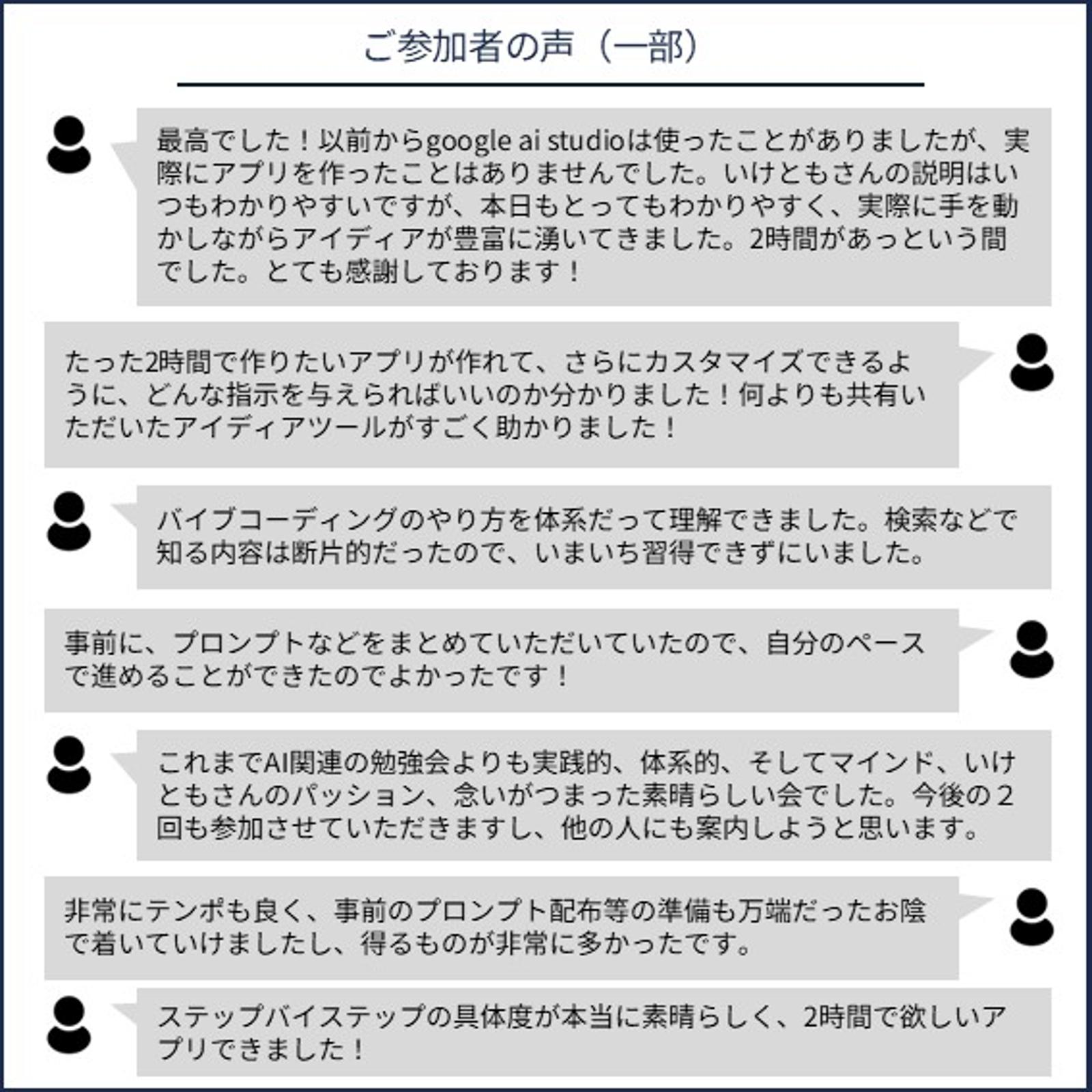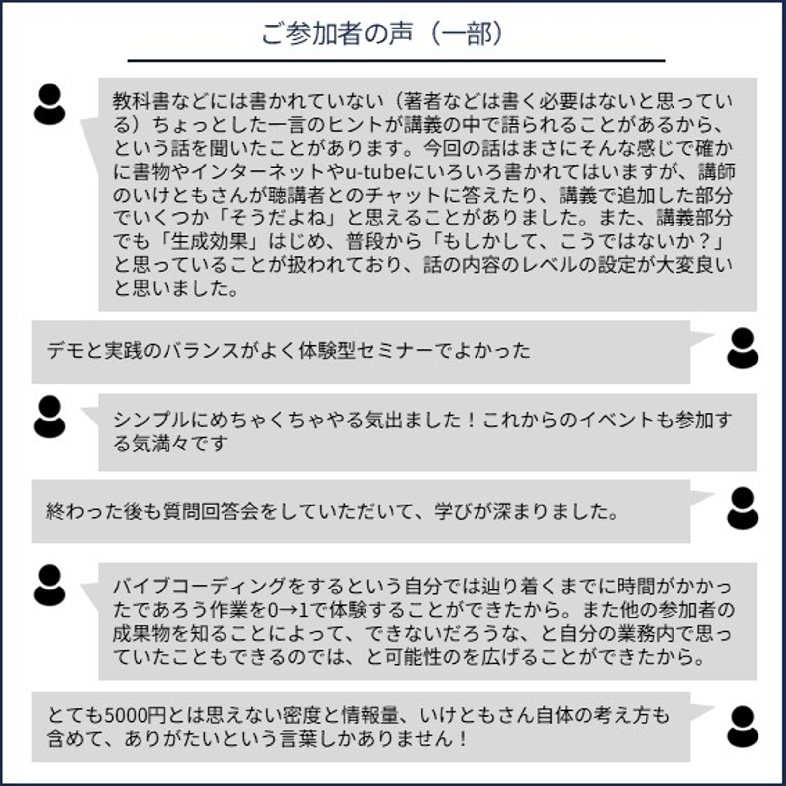 AIを使いこなすには、ただ聞いたり見るだけではなく、実際に自分で手を動かすのが重要です。ので、以下のようなスタンスだと、今回のイベントは価値が低いと思います。ゆっくりでもいいので、ぜひ主体的にやりましょう!
