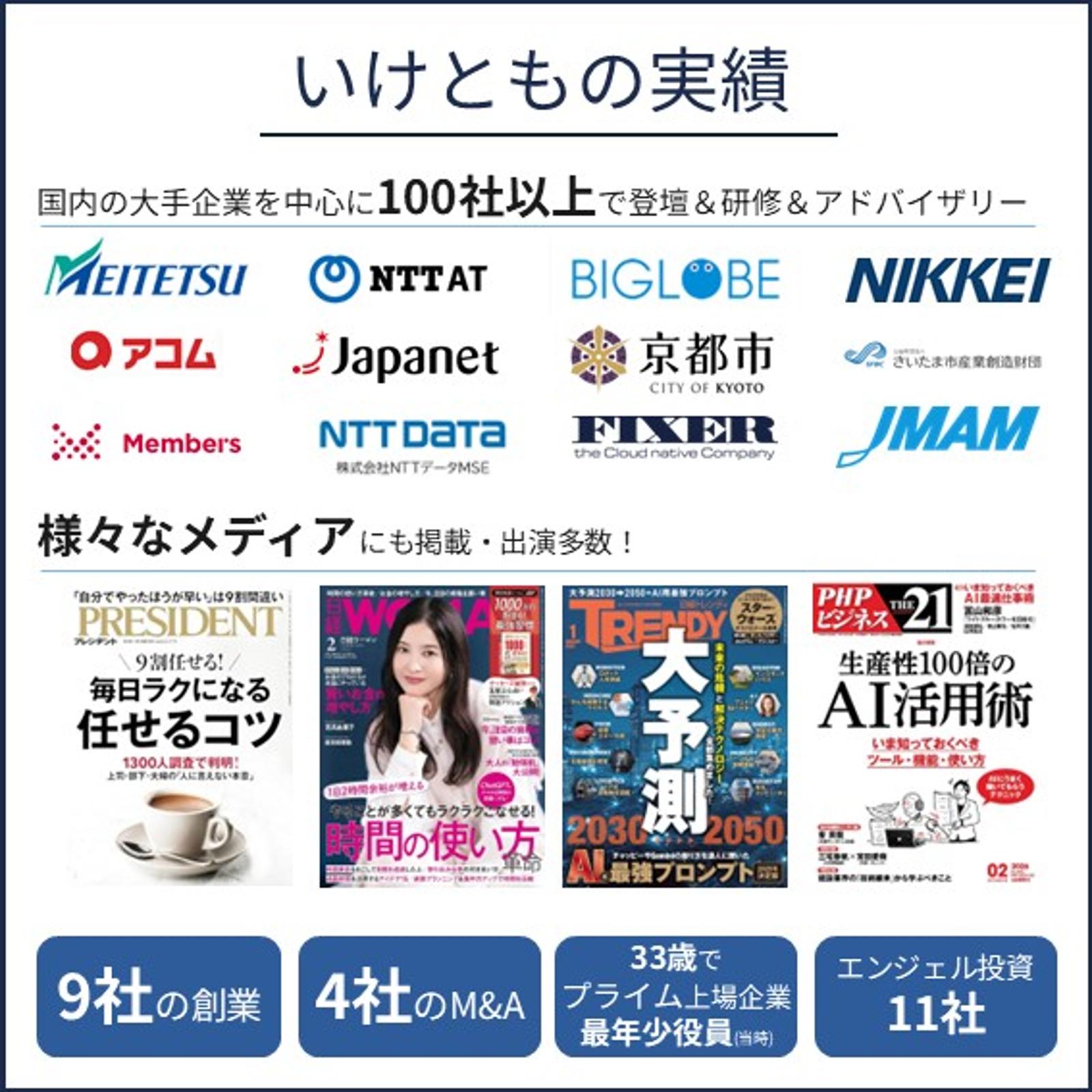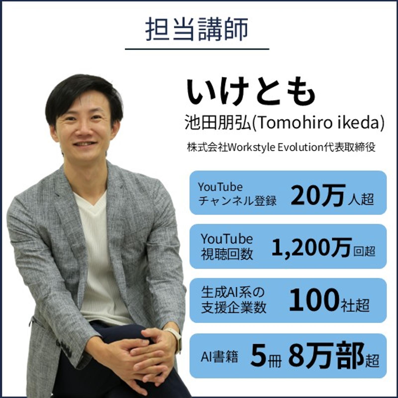 池田朋弘(いけとも) 株式会社Workstyle Evolution代表取締役 YouTubeチャンネル「いけともチャンネル」を運営、YouTube登録者は20万人超 100社以上に生成AI研修・導入支援を実施 著書『ChatGPT最強の仕事術』4.9万部、『Gemini最強のAI仕事術』2.3万部突破
