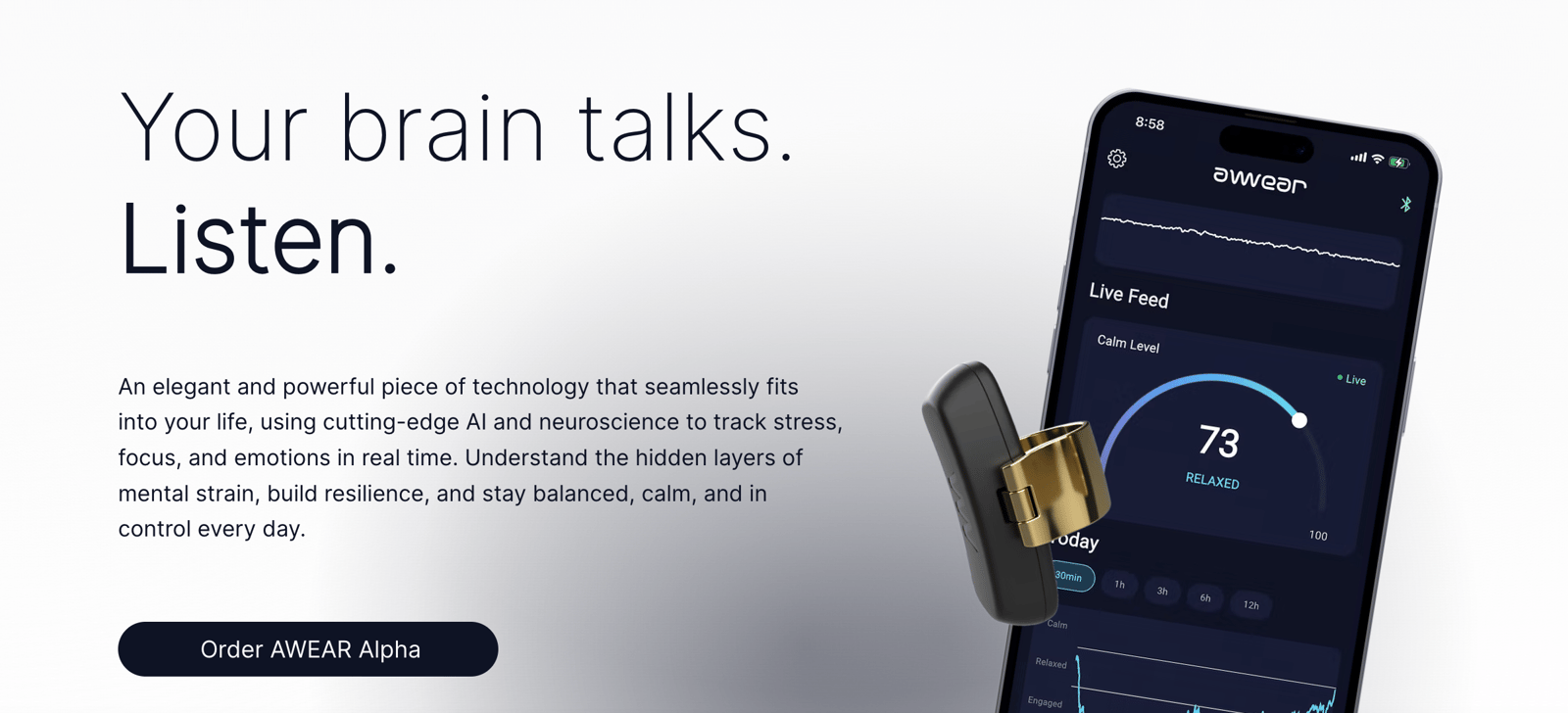 AWEAR is a mental wellness wearable that detects stress before you even notice it. Powered by EEG, this discreet smart ear patch continuously tracks your brainwaves and sends real-time insights to the app, helping you stay balanced, focused, and in control. Get your AWEAR Alpha with exclusive early-bird rewards and special pricing, available now on our website.