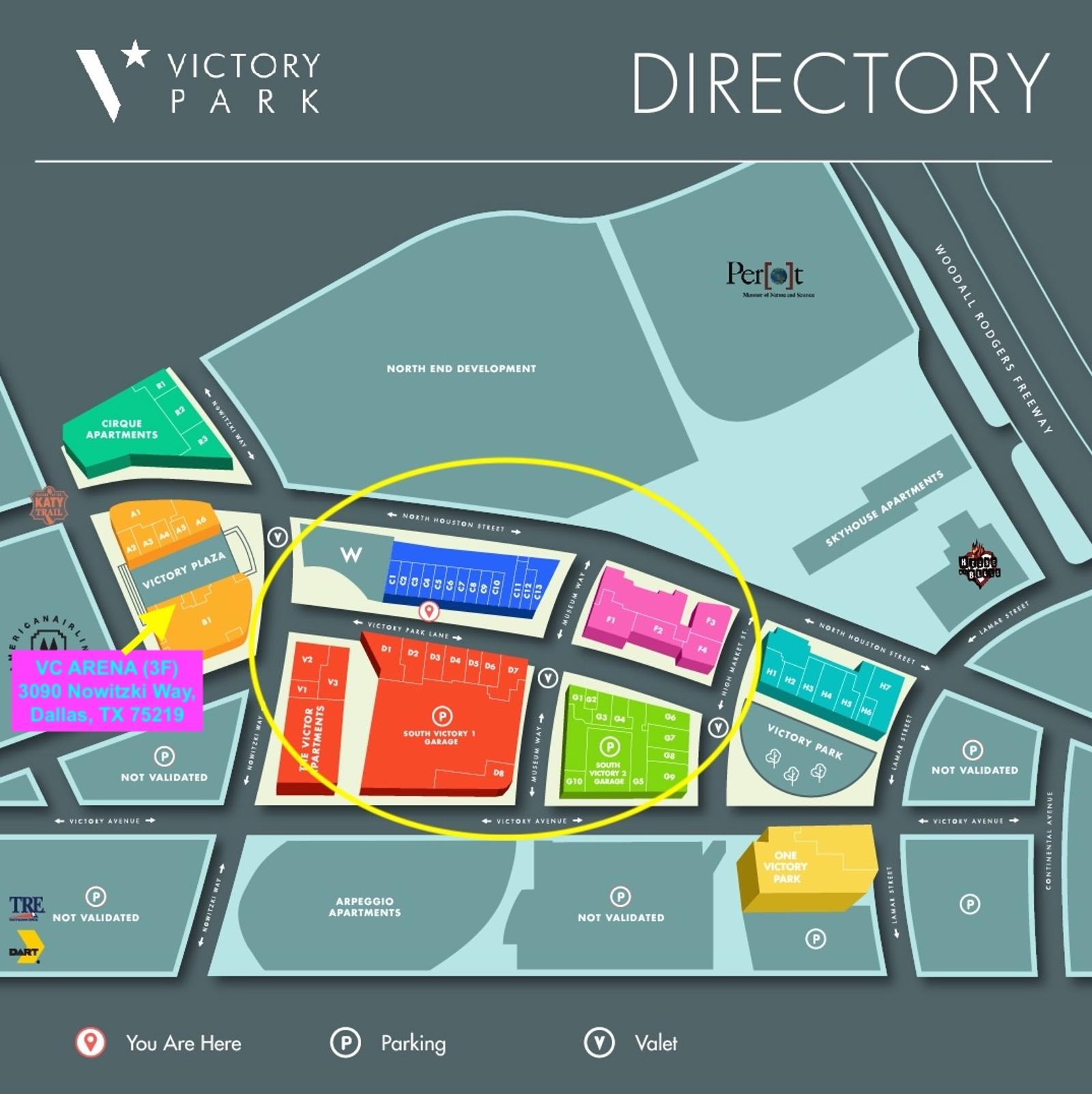 You can park along the street in the circle area, or at the South Victory 1 Garage across from the W Hotel on Victory Park Lane.
