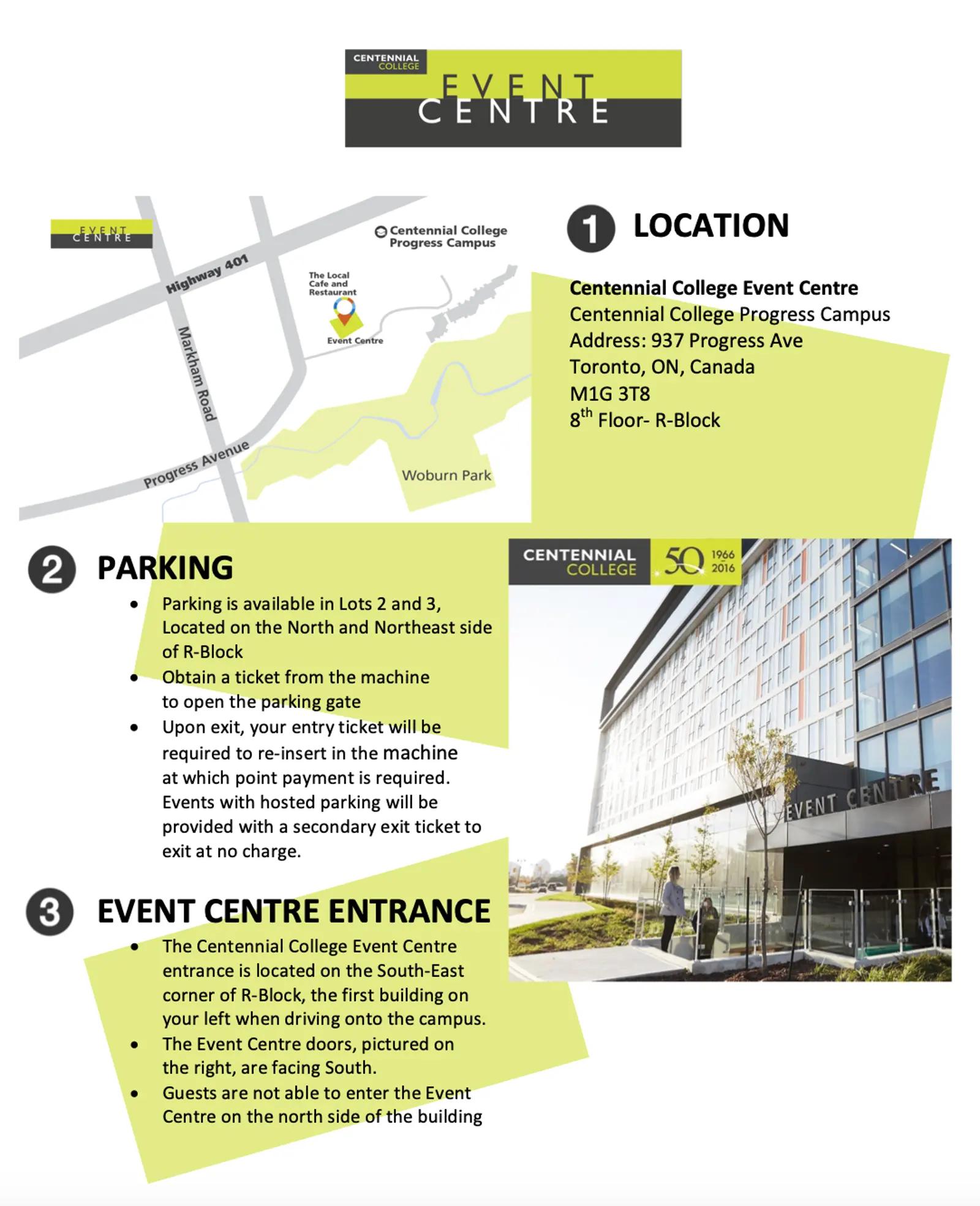 Located at: 937 Progress Avenue, Toronto, “R – Hospitality” Building, 8th floor (Enter building using any entrance, or use the separate entrance to Event Centre and elevators to the 8th floor. Signs for Event Centre are throughout the building.)