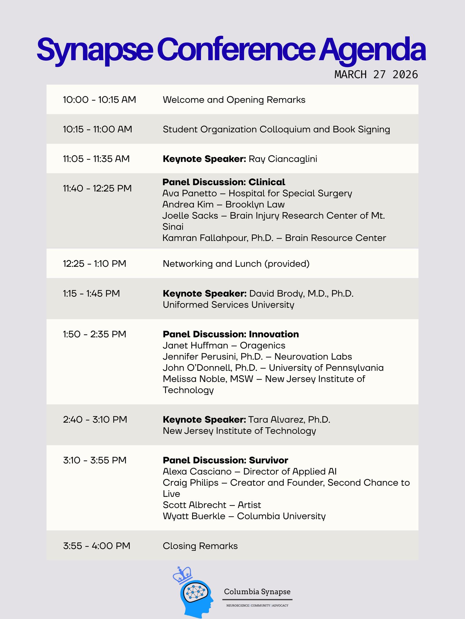 Columbia Synapse invites you to Crossroads in Traumatic Brain Injury: From Bench to Bedside... and Beyond on March 27, 2026, at Columbia University (Kraft Center) along with a virtual option on Zoom.