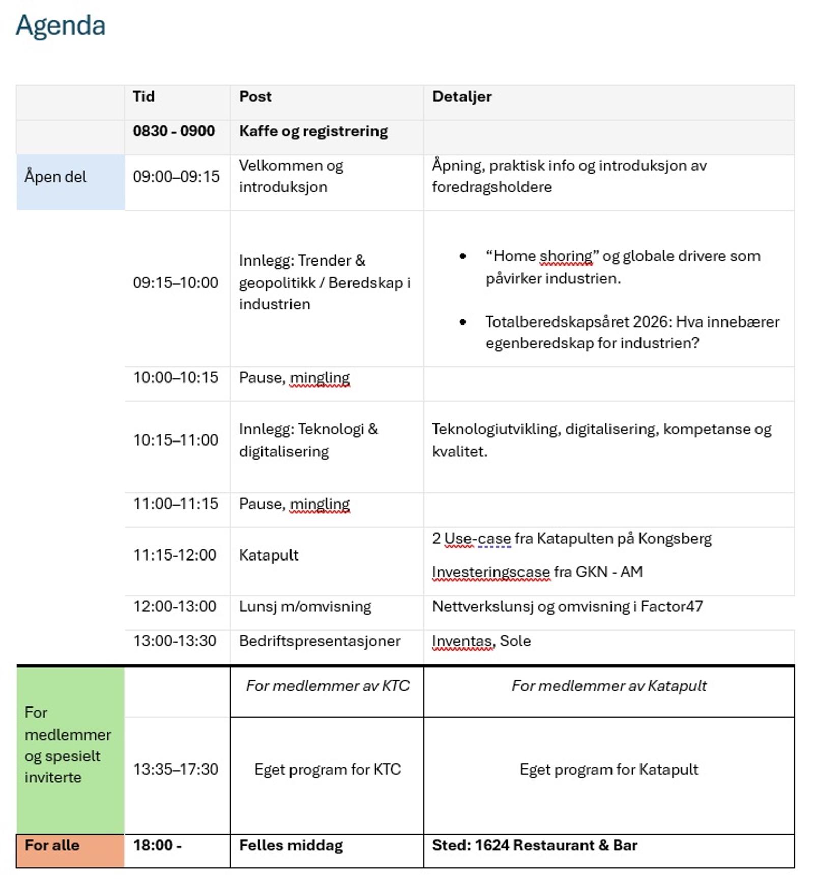 Onsdag 19. mars inviterer Kongsberg Technology Cluster (KTC) og Katapulten på Kongsberg til åpen partnersamling i hjertet av norsk høyteknologi. Dagen er åpen for alle som er nysgjerrige på trender, beredskap, teknologi og fremtidens produksjon – uansett om du er fra industri, akademia, leverandørkjede, offentlig sektor eller bare brenner for innovasjon.