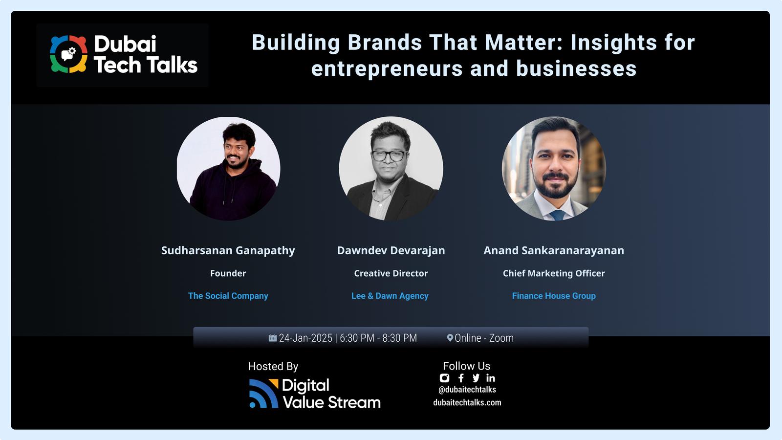 Join us for an engaging and insightful online event, hosted by Digital Value Stream, where branding experts Sudharsanan Ganapathy, Founder of The Social Company, Dawndev Devarajan, Creative Director at Lee & Dawn Agency and Anand Sankaranarayanan, Chief Marketing Officer, Finance House Group, will delve into the art and science of building impactful brands in the digital era.