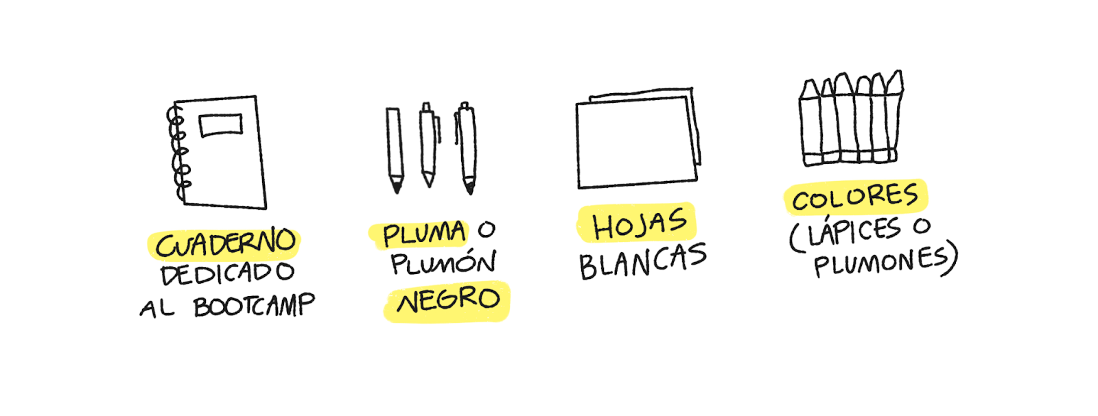 No se necesita material en específico, aunque se sugiere contar con un cuaderno dedicado a este Bootcamp y material para escribir y dibujar. La recomendación es: