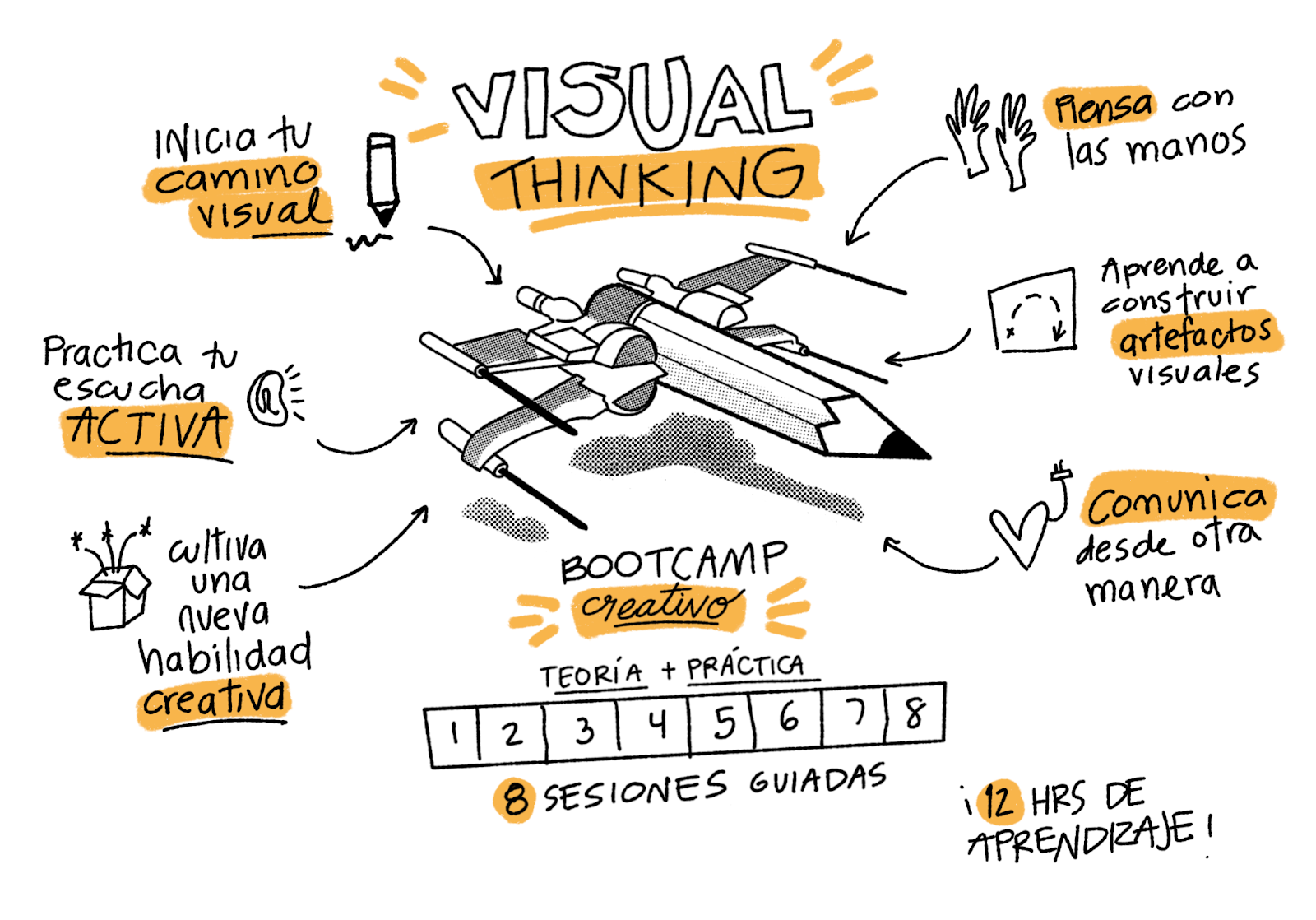 Este es un Bootcamp Creativo mediante el cuál durante 8 sesiones estarás en compañía de un mentor en Visual Thinking quien guiará tu aprendizaje paso a paso con explicaciones teóricas y muchos ejercicios prácticos para que comiences a adoptar esta habilidad.