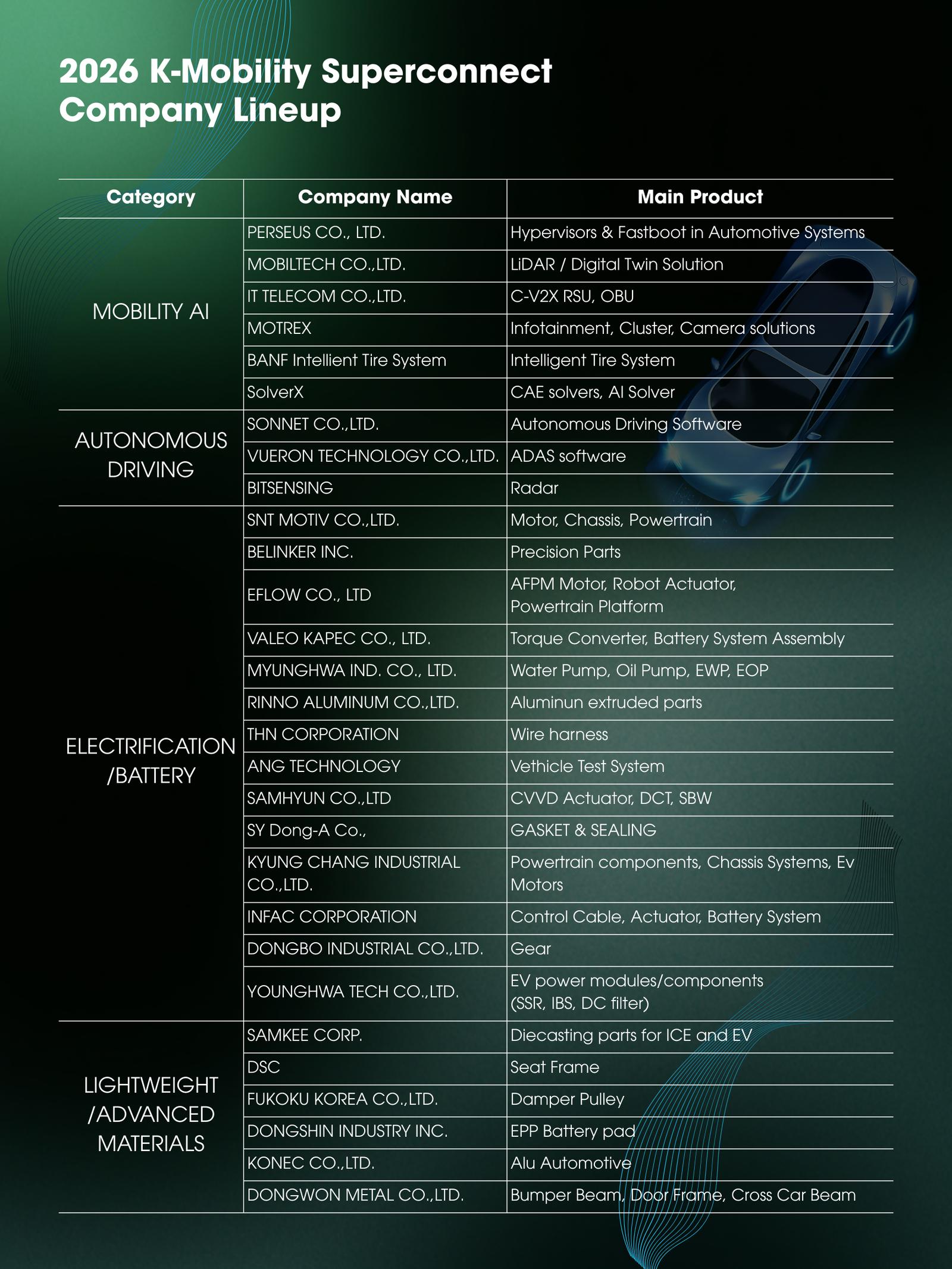 Participants are organized across four sectors: Mobility AI, Autonomous Driving, Electrification & Batteries, and Lightweighting & Advanced Materials—spanning the core technologies accelerating software-defined, AI-powered mobility.