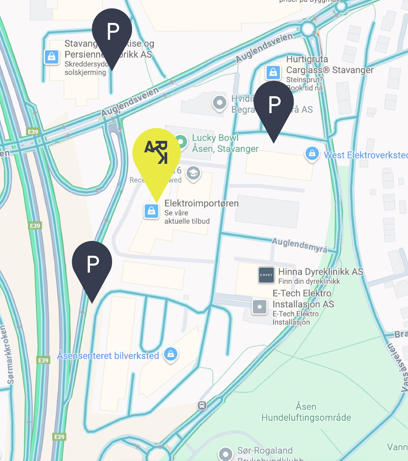 Gjeldende parkering: Vi skal være i ARK – Auglendsmyrå 11-17 (markert med gul pin på kartet nedenfor).