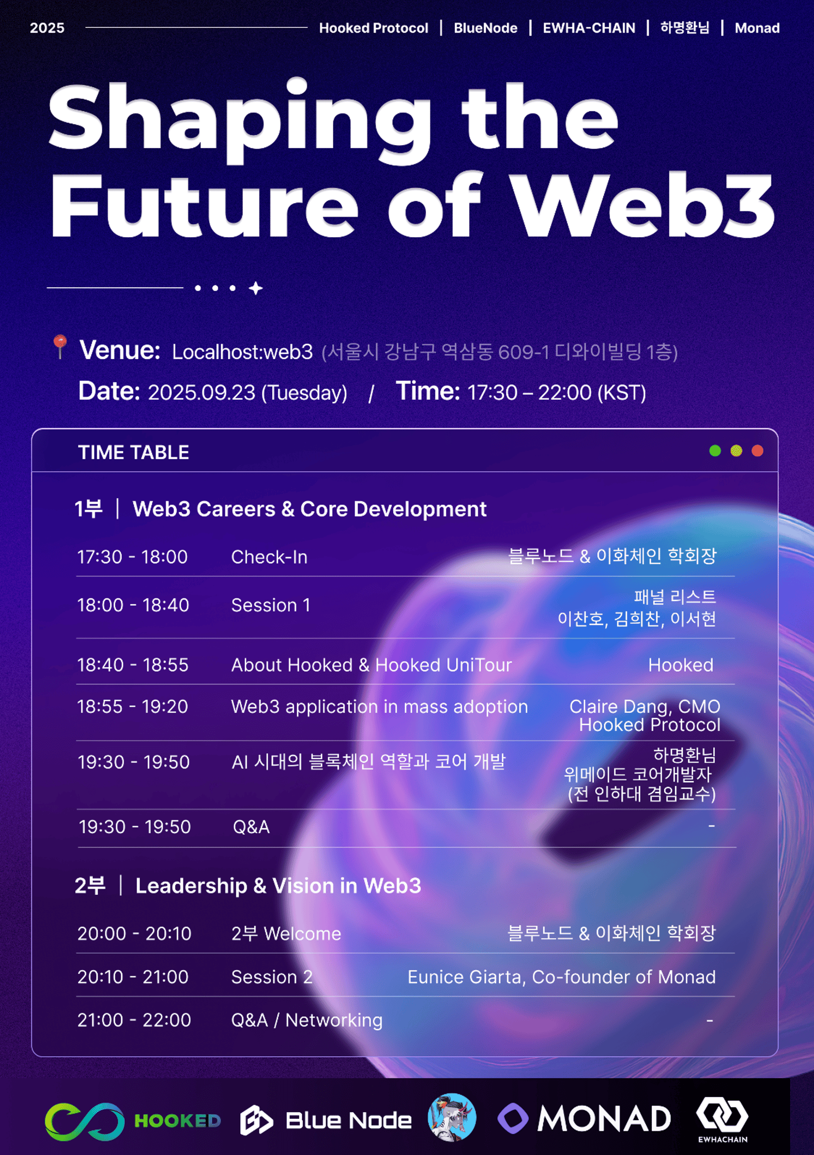 <Shaping the Future of Web3 @KBW> brings together Hooked Protocol UniTour, BlueNode, and EWHA-CHAIN with speakers from Univ Students, Wemade and Monad, offering Web3 career sessions, networking, and panels for students, builders, and the crypto community.
