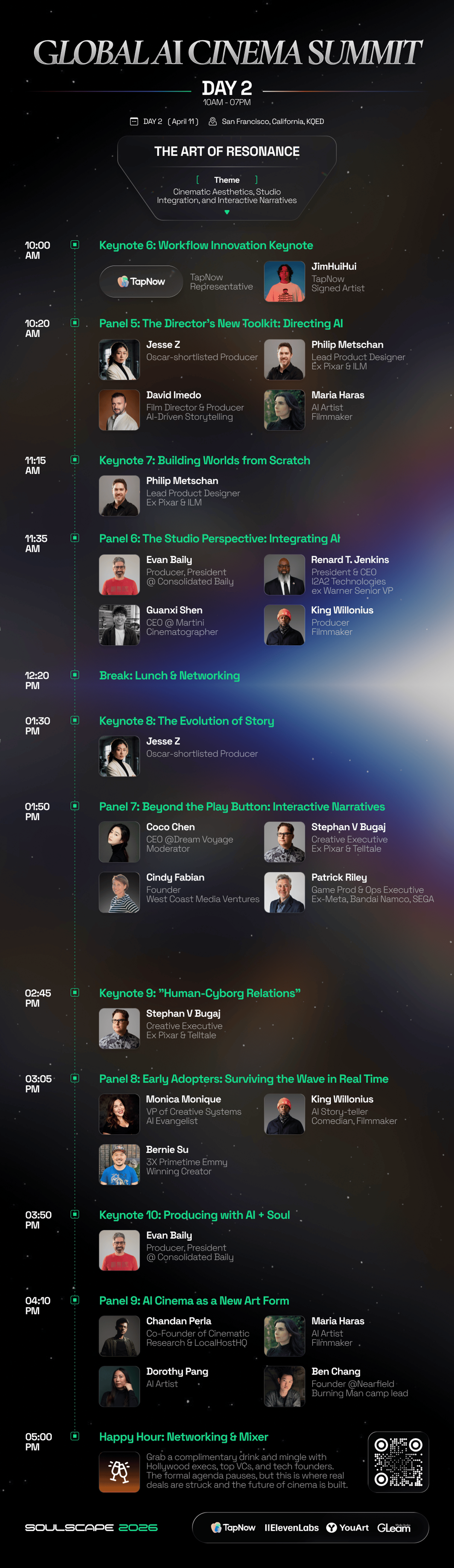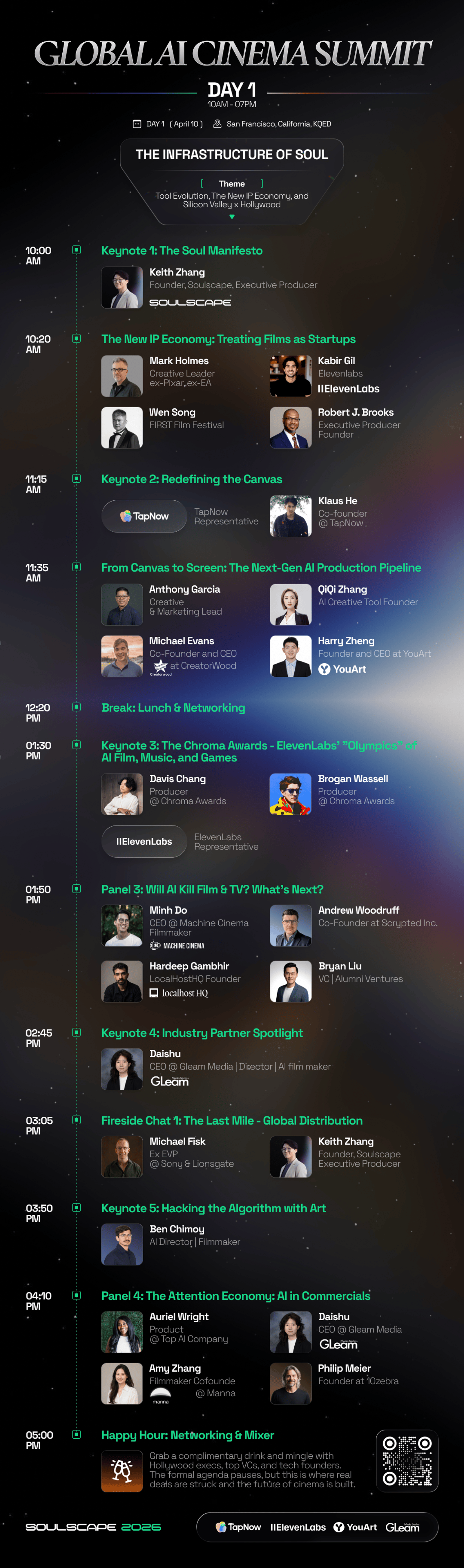 βSoulscape 2026 is the world's first AI Cinema Lab & Summit, bridging Silicon Valley tech with Hollywood storytelling. While 200 elite creators battle in our closed-door Lab, 1,000+ attendees will build their "Prompt to Premiere" pipeline alongside Oscar winners, The Matrix and Pixar legends, studio EVPs (Paramount, Warner Bros., Sony), AI titans (OpenAI, Gemini, Seedance 2.0), and elite VCs (a16z, YC, SPC).