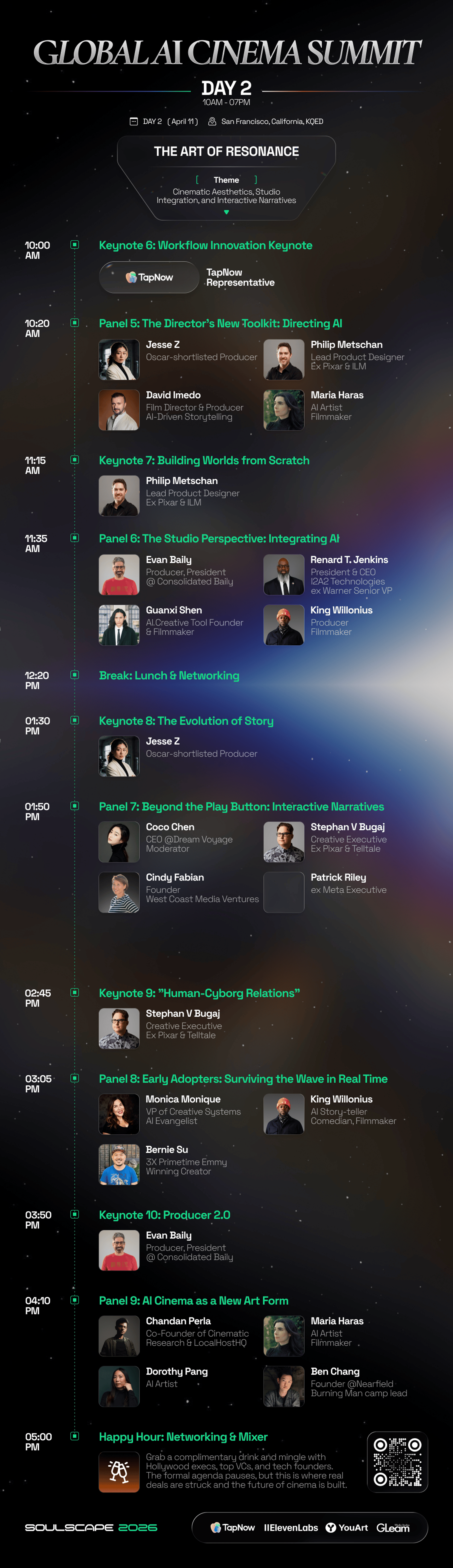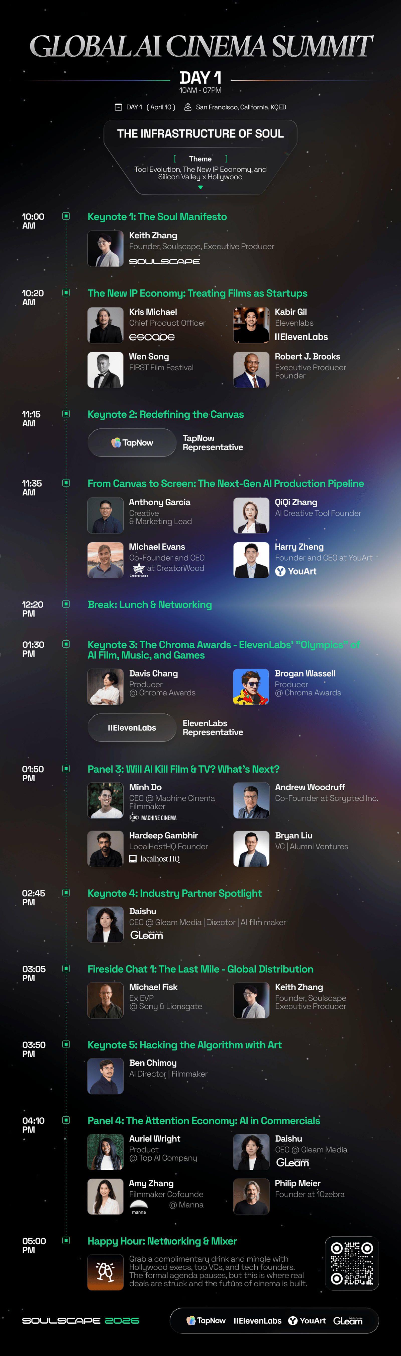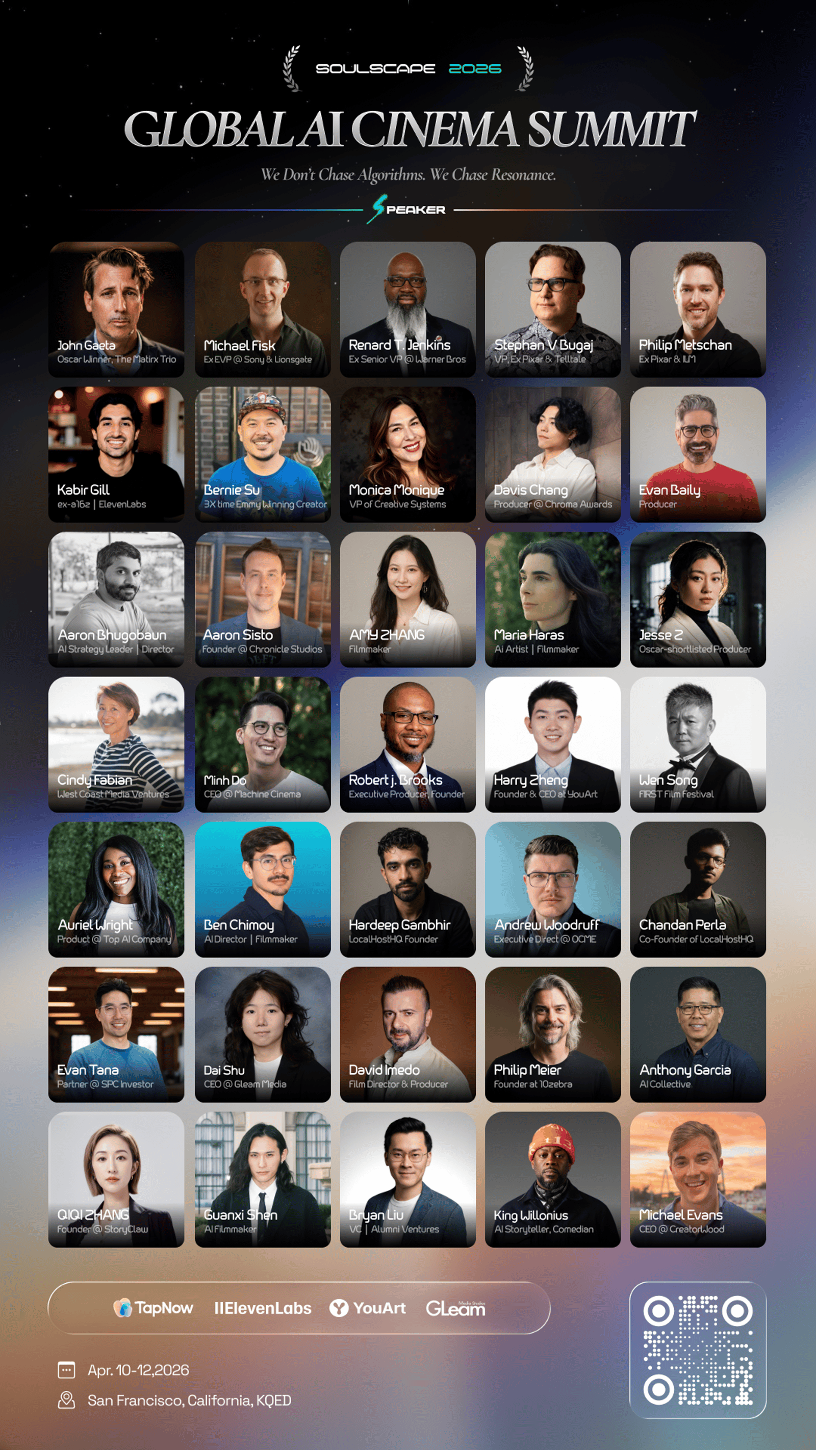 βSoulscape 2026 is the world's first AI Cinema Lab & Summit, bridging Silicon Valley tech with Hollywood storytelling. While 200 elite creators battle in our closed-door Lab, 1,000+ attendees will build their "Prompt to Premiere" pipeline alongside Oscar winners, The Matrix and Pixar legends, studio EVPs (Paramount, Warner Bros., Sony), AI titans (OpenAI, Gemini, Seedance 2.0), and elite VCs (a16z, YC, SPC).