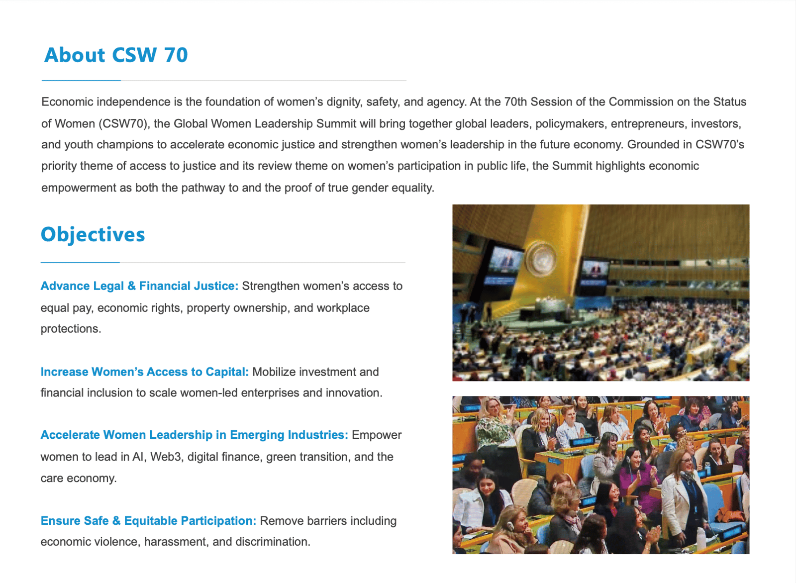 Grounded in CSW70’s priority theme of access to justice and women’s participation in public life, the Summit positions economic empowerment as the foundation of dignity, safety, and agency. With less than five years remaining to deliver the 2030 Agenda, structural transformation across law, finance, and economic leadership is urgent — and women’s leadership is decisive.