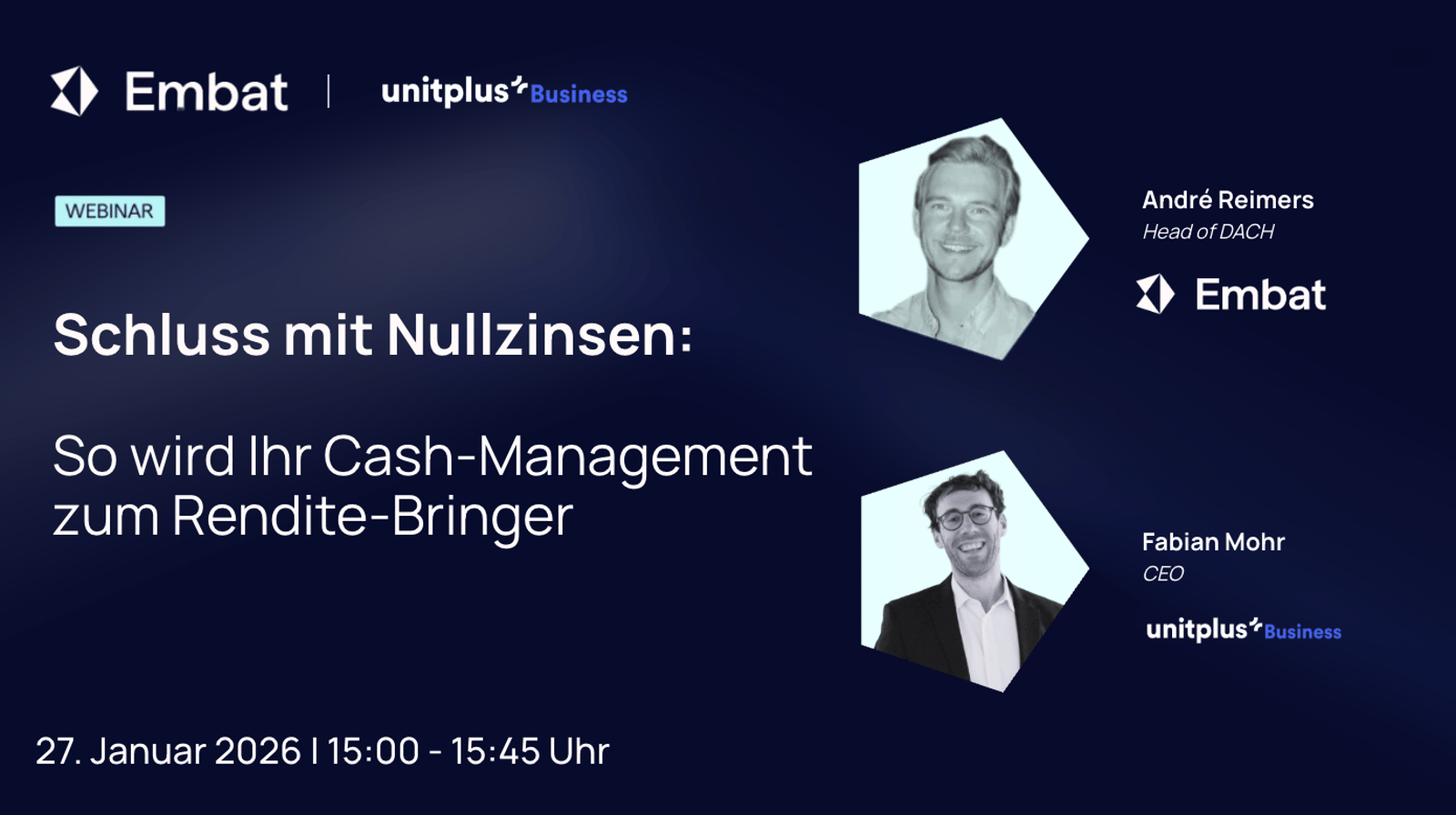 In unserem gemeinsamen Webinar von Embat und UnitPlus Business zeigen wir Ihnen, wie Sie Ihr Treasury aus der Defensive holen und Liquidität intelligent arbeiten lassen.