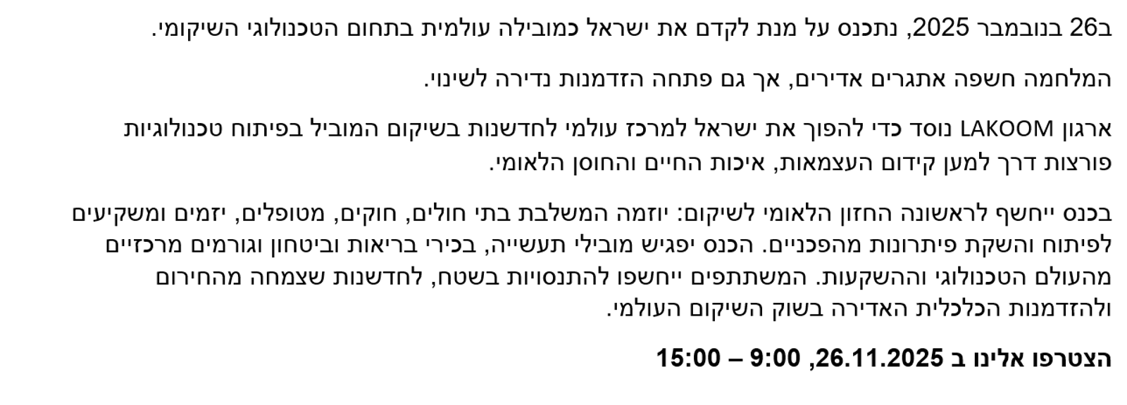 On November 26, 2025, we're gathering at Meitar Law Offices to launch a new effort to position Israel as a global powerhouse in rehabilitation technologies. This is your opportunity to be part of a defining moment: industry leaders, entrepreneurs, investors, and medical innovators will convene to shape the National Rehabilitation Agenda together - from vision to actionable first steps.
