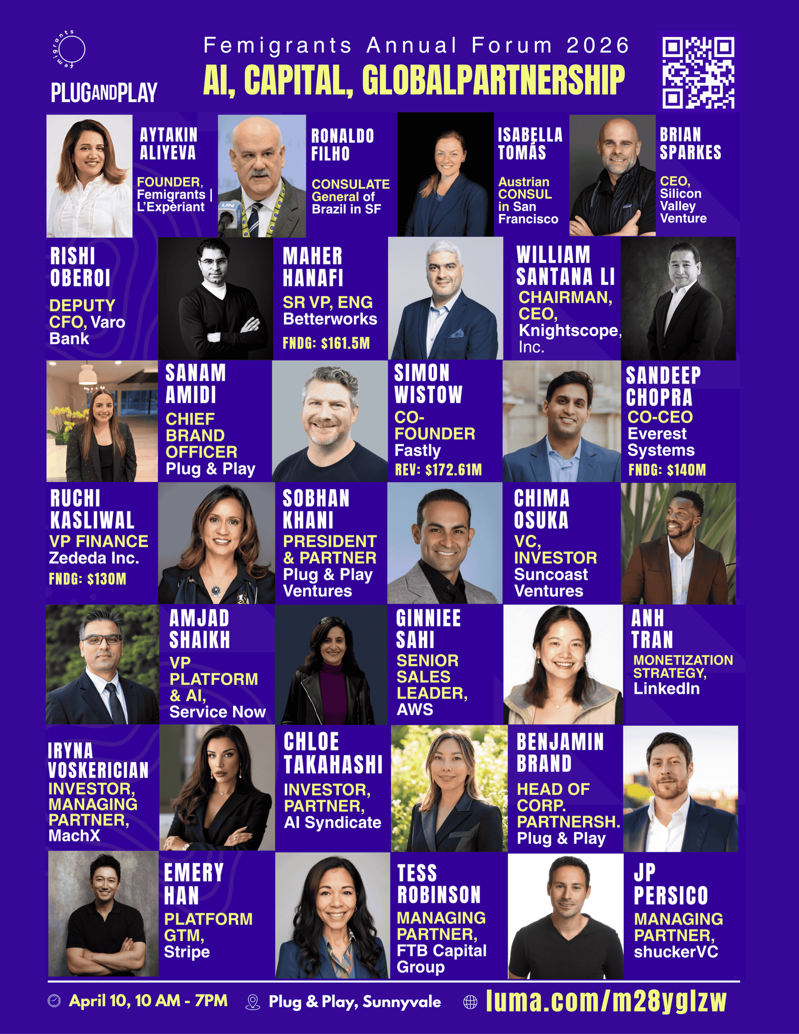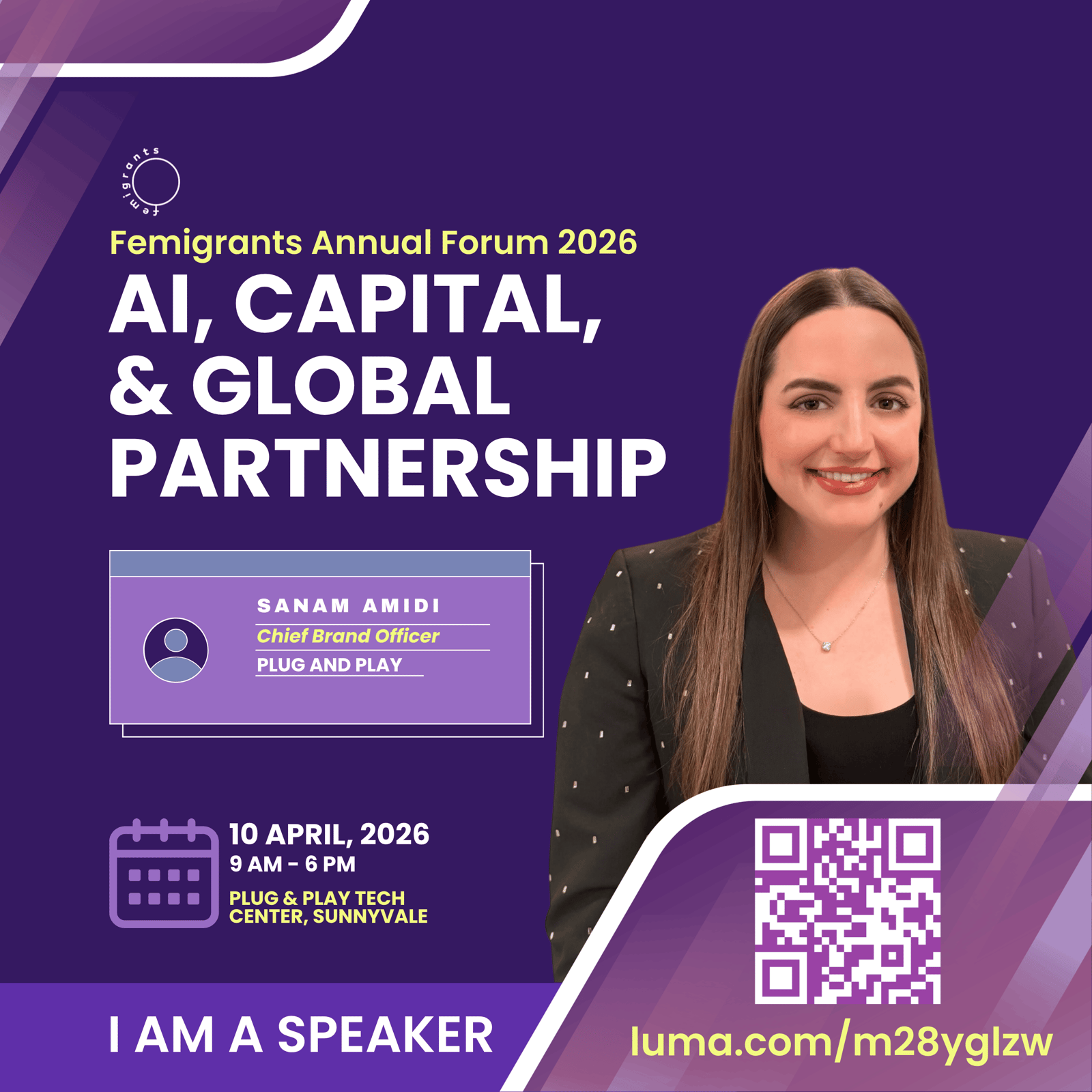 A special thank-you to Sanam (Amidi) Amidhozour — Chief Brand Officer, Plug and Play Tech Center (PNPTC), COO & Treasurer of the PNPTC Foundation, and Silicon Valley Business Journal’s 40 Under 40 (Class of 2025)—for supporting Femigrants’ mission and helping bring this forum to life.