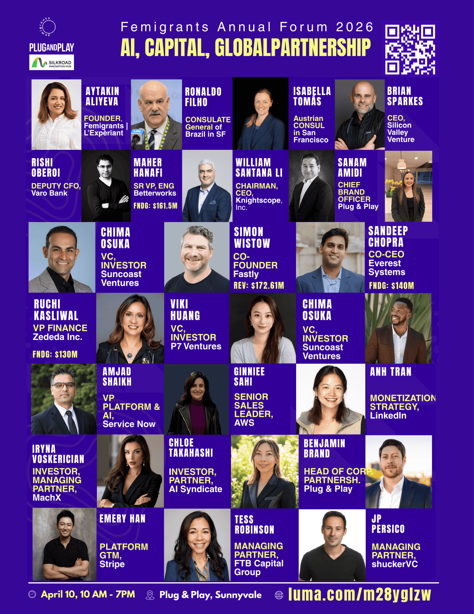 A special thank-you to Sanam (Amidi) Amidhozour — Chief Brand Officer, Plug and Play Tech Center (PNPTC), COO & Treasurer of the PNPTC Foundation, and Silicon Valley Business Journal’s 40 Under 40 (Class of 2025)—for supporting Femigrants’ mission and helping bring this forum to life.