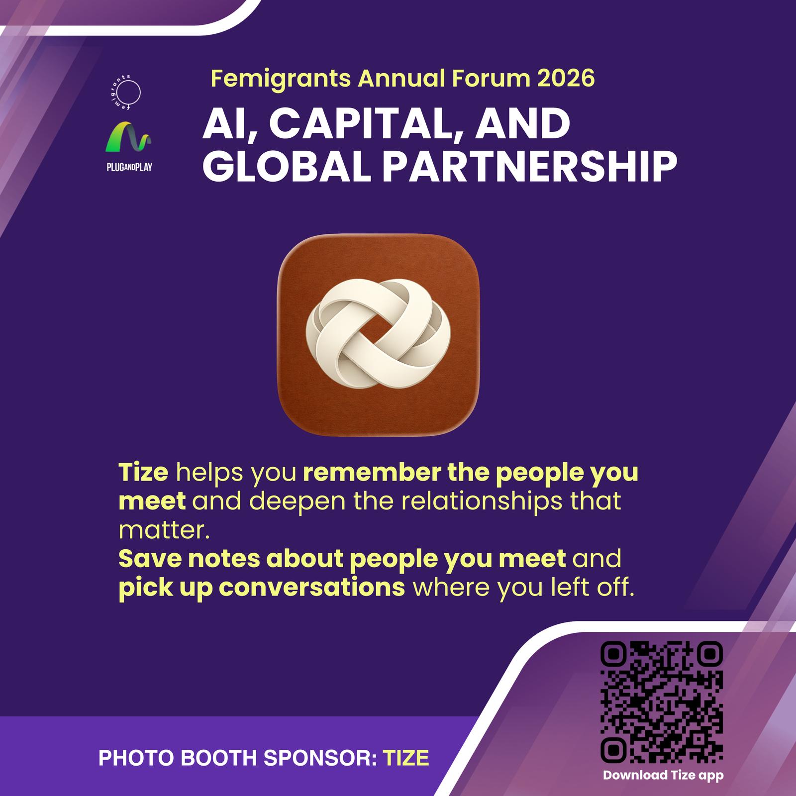 This event photobooth is sponsored by Tize, a startup founded by immigrants with a mission to make it easier to be thoughtful. Tize helps you quickly save notes about people you meet, so you can turn weak ties into strong ones and pick up conversations where you left off. Tize is an iOS app that's private by design, so your notes stay securely with you, and only you. No more forgetting and no more losing notes in scattered docs or emails. Be sure to visit the Tize table today, download the app from the iOS App Store, and use it to quickly jot down meaningful notes about the people you meet at this conference.