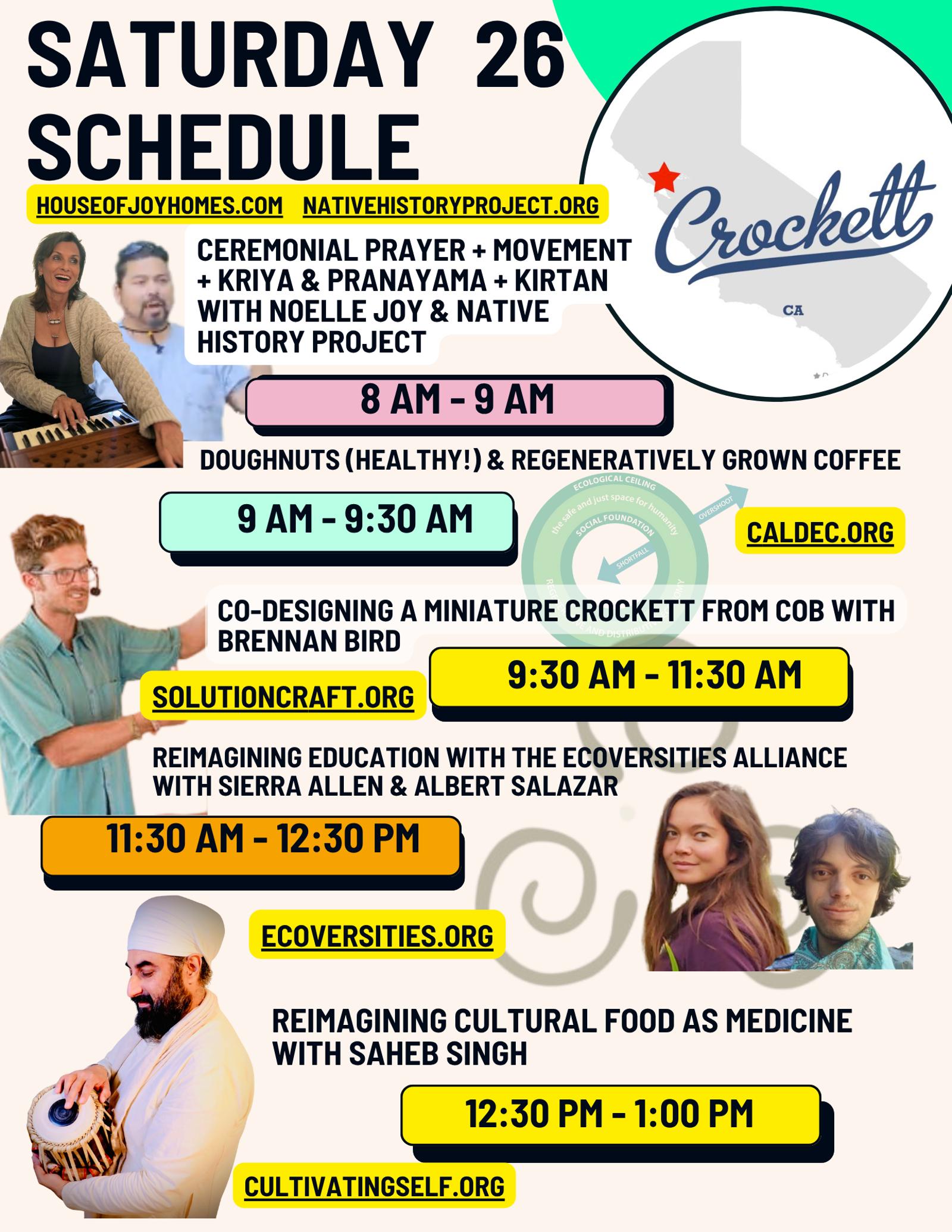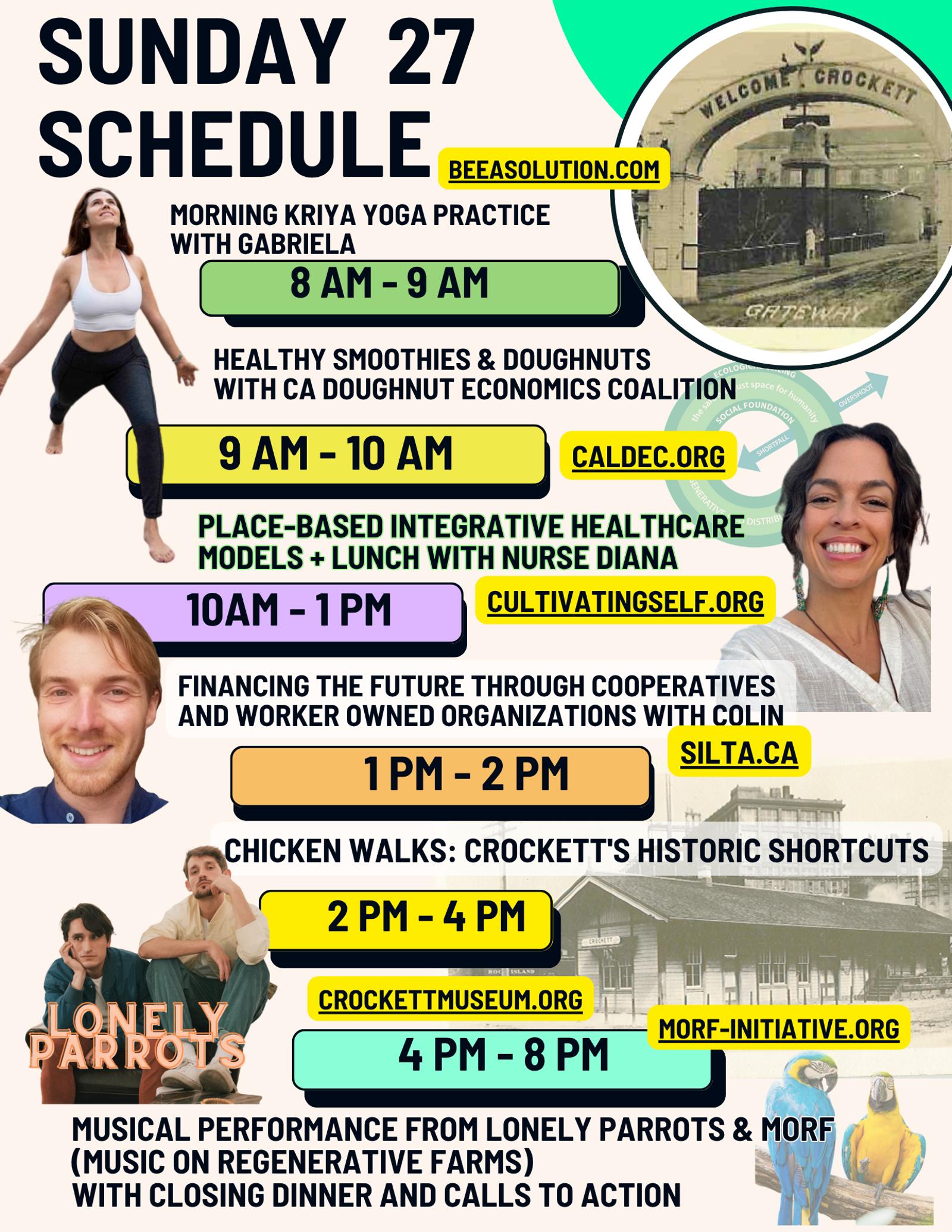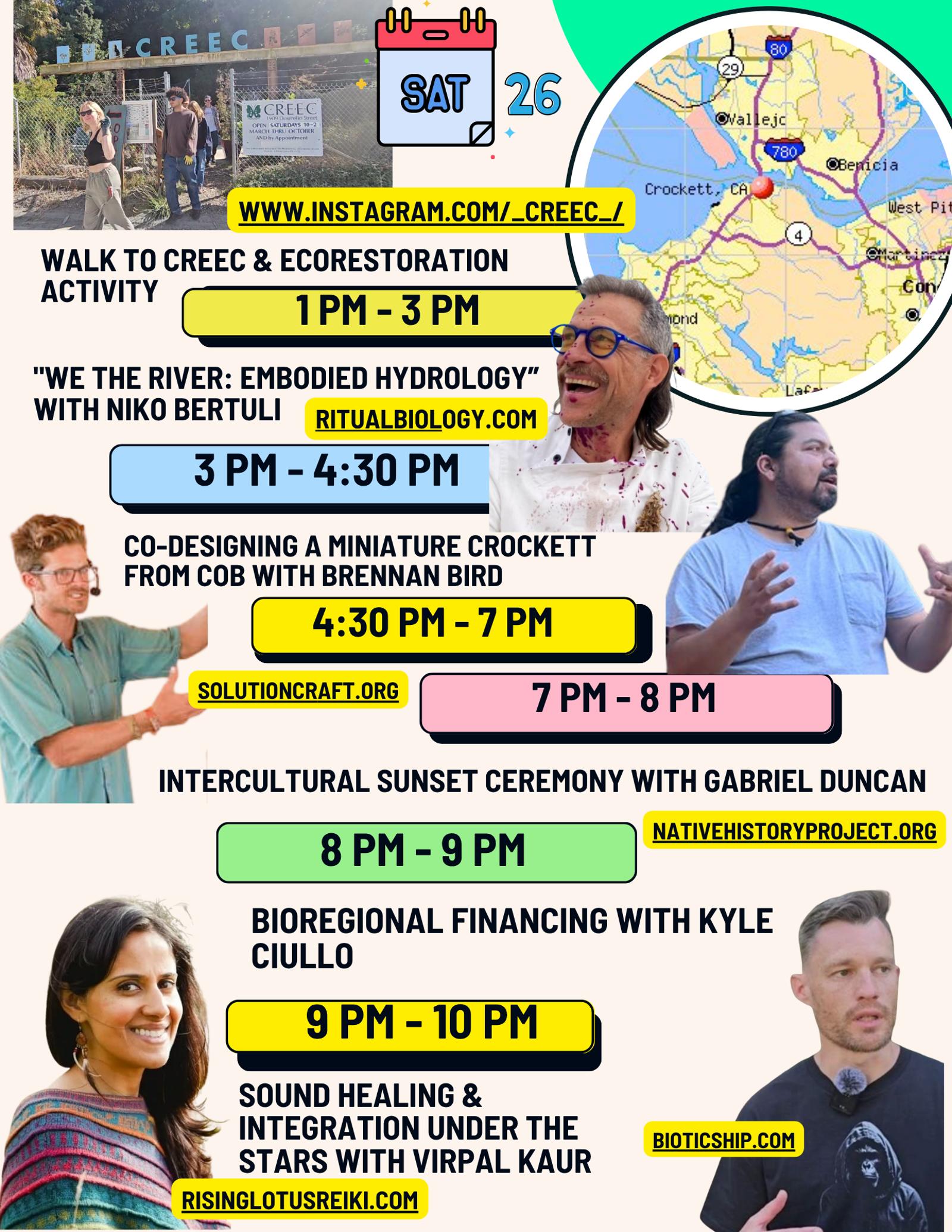 Cultivating Self will be leading various nutrition, healthcare, and ecotherapy sessions to reframe healthcare. Rising Lotus Reiki will share some healing resilience tools including sound and Reiki. Alameda Native History Project will be leading local, indigenous ecological playshops to learn about food resilience and security and healing land curses because of shellmound abuse. Bioticship will be sharing ways to develop regenerative and care-based businesses around "healing" the doughnut economics of the bioregion.