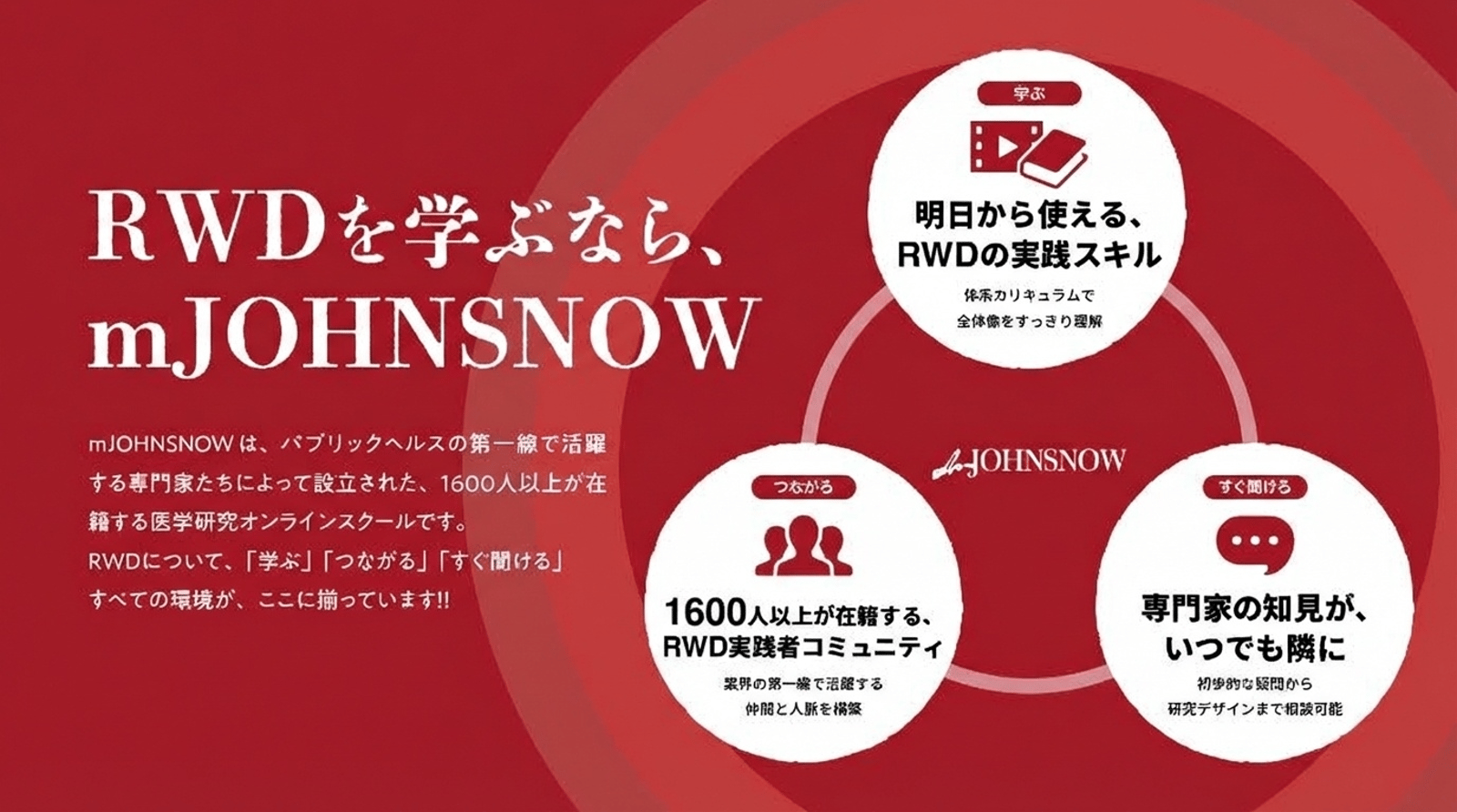 mJOHNSNOWは、RWDの基礎から応用、実践までを体系的に学べる日本最大規模の医学研究オンラインスクールです。