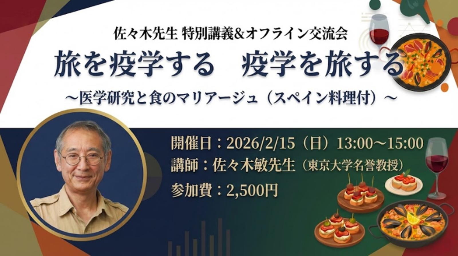 【50名限定】佐々木先生 特別講義&オフライン交流会旅を疫学する 疫学を旅する~医学研究と食のマリアージュ(スペイン料理付)~
