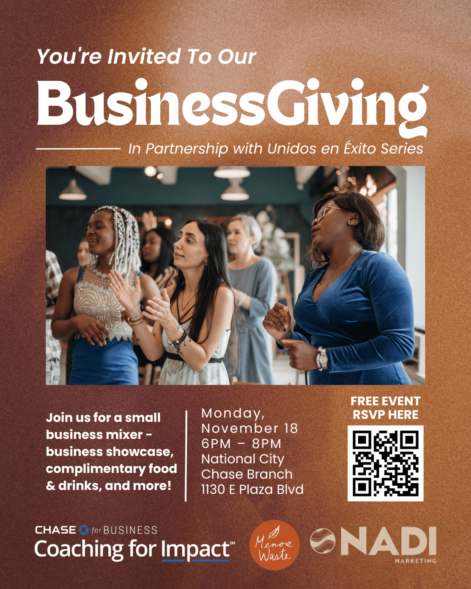 The event is hosted by Chase for Business Coaching for Impact, Menos Waste, and Nadi Marketing.