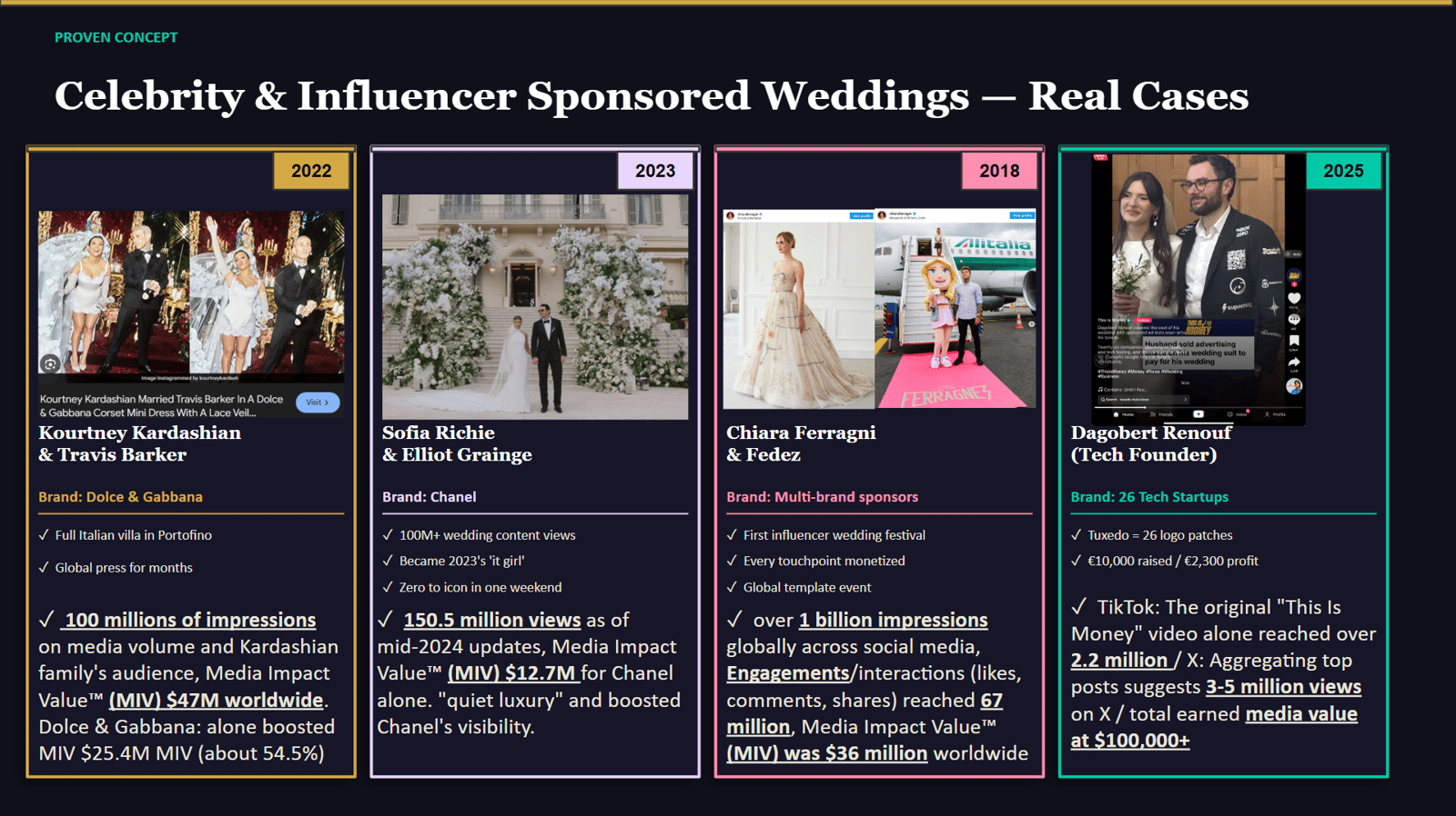 Get ready for an event where you will see tech brand logos integrated into the groom’s suit, photo backdrops, and various touchpoints. (However, we have one strict rule: the bride’s dress and the main ceremonial areas will remain completely brand-free to preserve the purity and beauty of our family's memories).