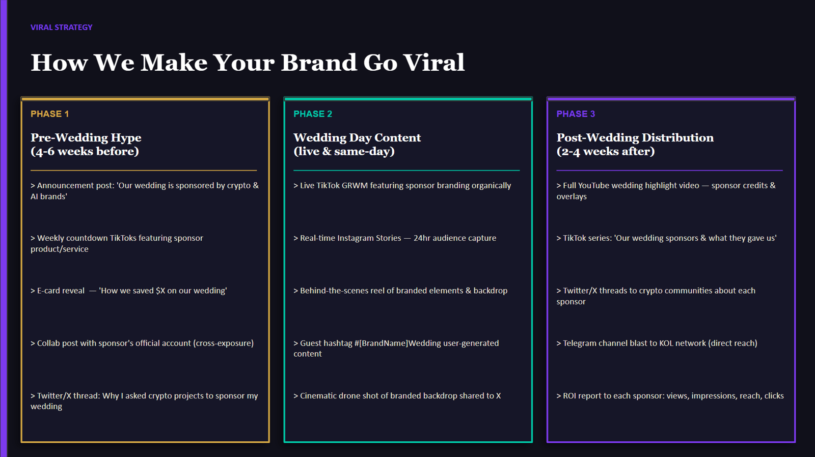 This is the wedding making headlines across business and crypto media! Inspired by a global viral phenomenon that garnered over 5 million views, we are turning our wedding into a global viral engagement space. We are proud to be supported by top-tier Crypto projects, AI startups, Web3 platforms, and leading financial institutions.