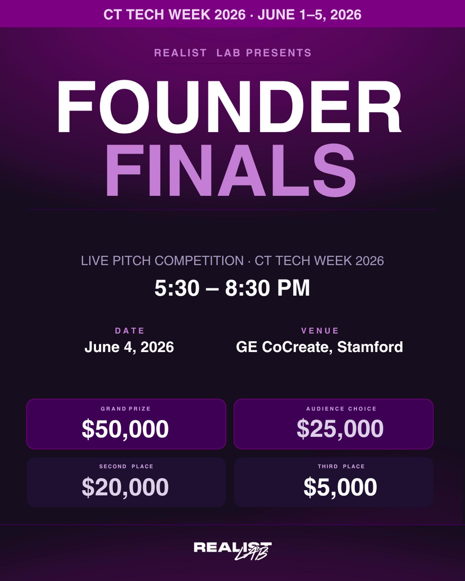 Founder Finals brings together selected Realist Lab alumni founders — builders with traction, real businesses, and a vision for what's next — to pitch in front of a live audience of investors, operators, and the broader Connecticut innovation community.