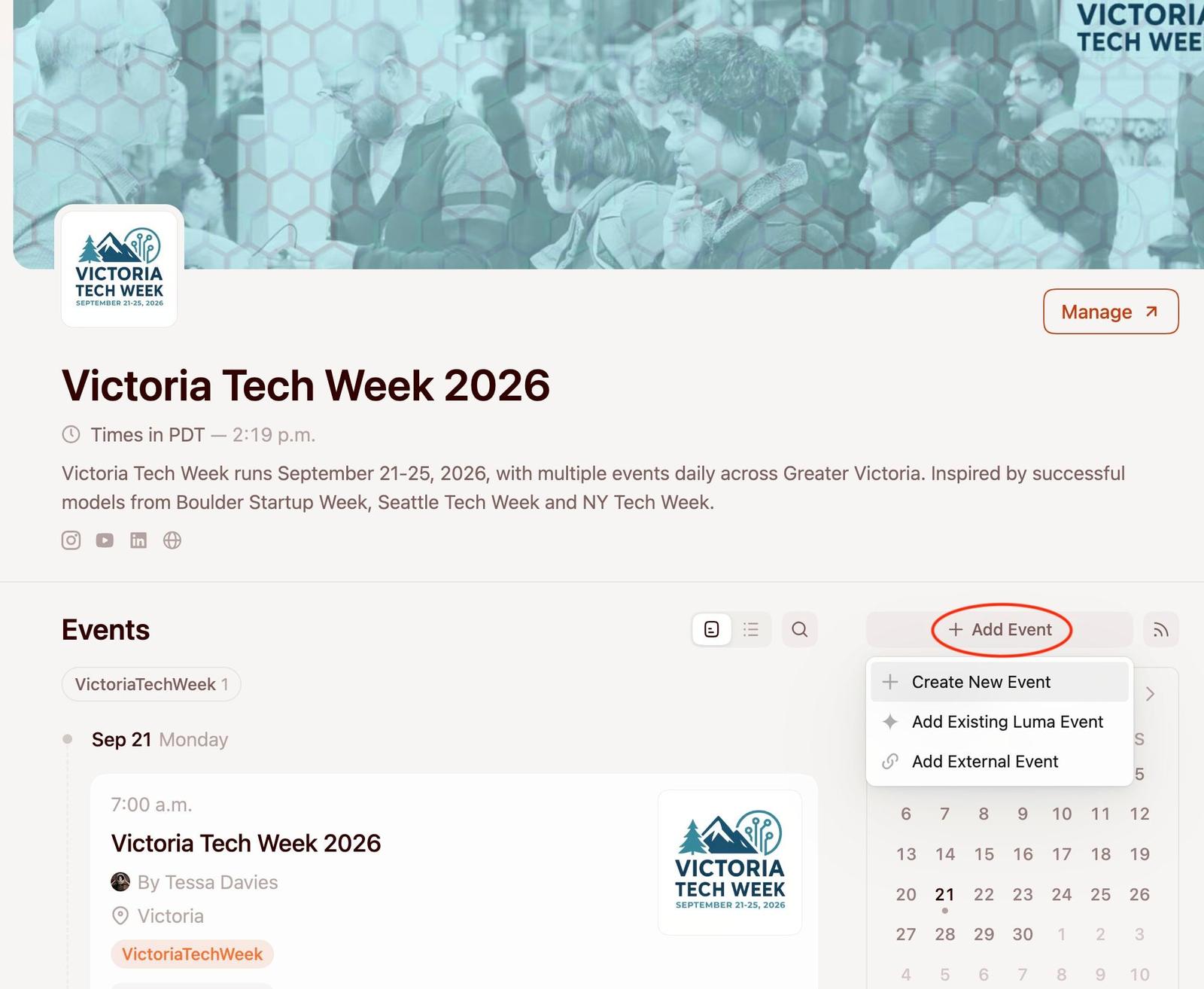 This year's public calendar is hosted on Luma: https://luma.com/victoriatechweek2026