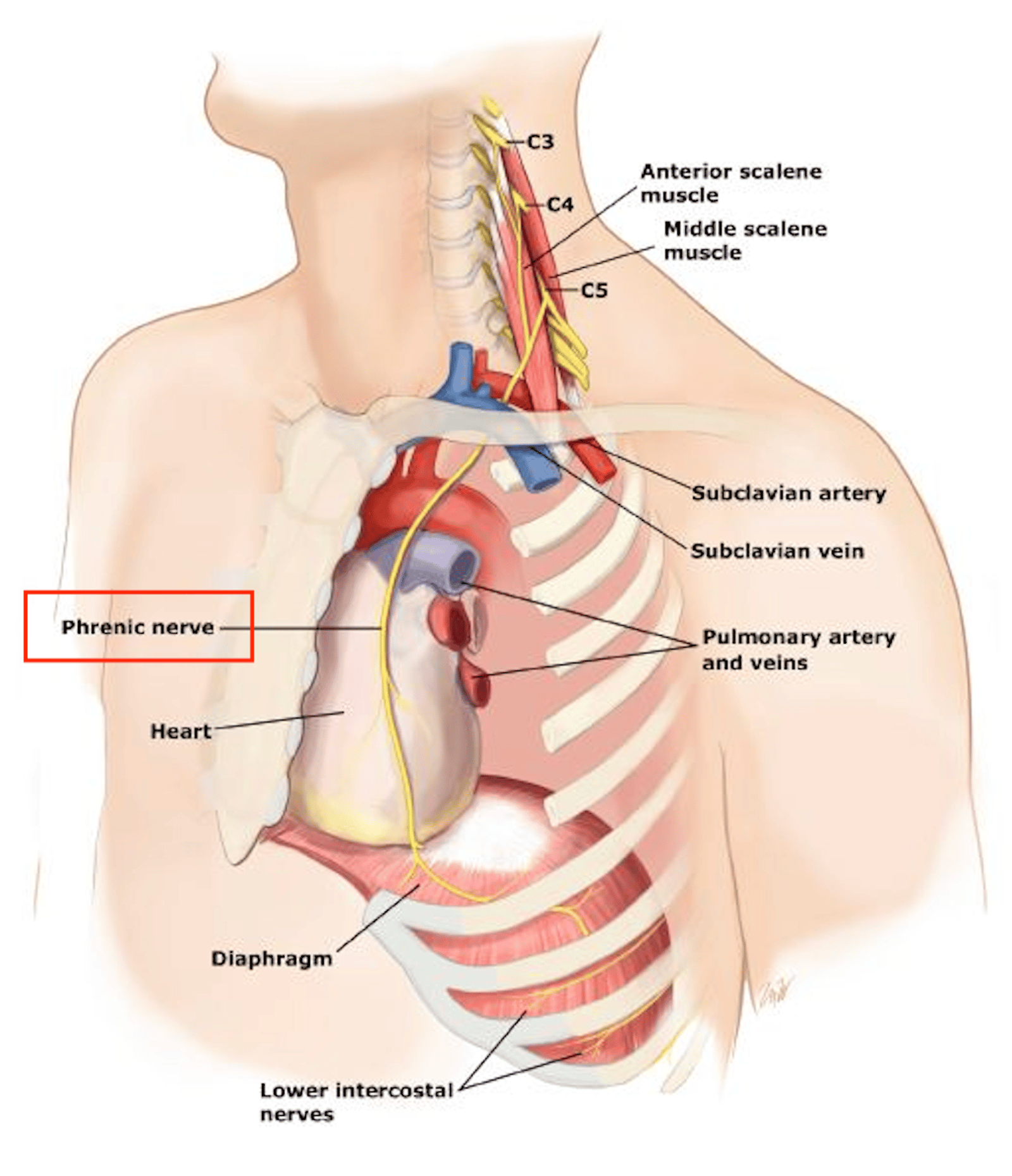 βLook at the image above, PN is wrapped around the scalenes (neck muscles), when we are in our fight and flight mode, subconsciously our scalenes contract, heart rate increases, our phrenic nerve isn't exactly happy with the restricted space, thus not too surprisingly, the signal that is sent to our diaphragm and heart is also less than calm.